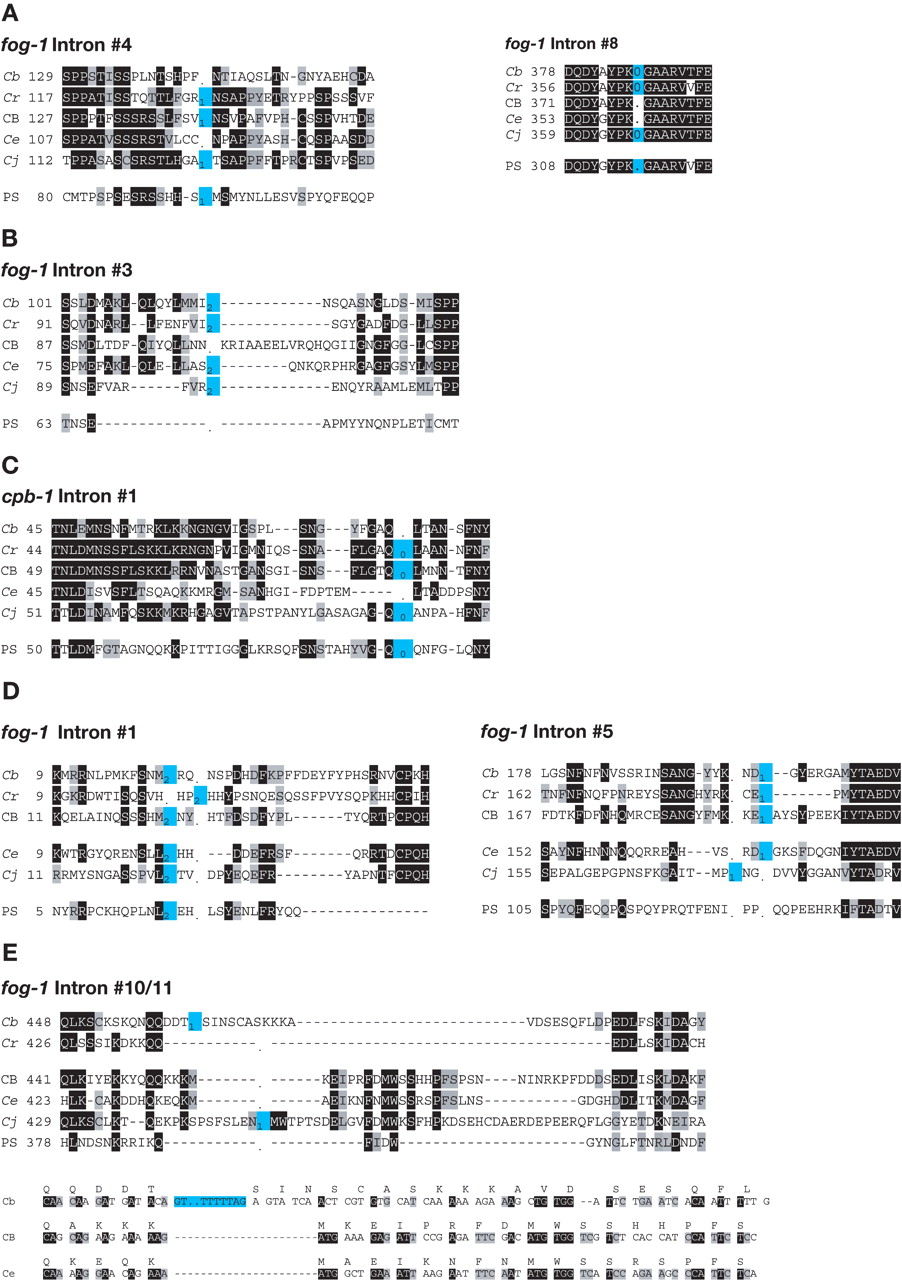 (A) Perfect deletions. (B) Deletion with 3′ insertion. (C) Deletion with associated mutation. (D) Intron sliding. (E) Intron insertions. Sequences of selected intron sites. The starting position of each sequence follows the species name. Identical amino acids are shaded black, similar ones are shaded gray, and intron sites are colored blue. A “-“is used for amino acid gaps, and a “.” for intron gaps. Phase 0 introns lie between the indicated codons, and phase 1 or 2 introns lie within the codon to the left. The bottom half of E contains nucleotide sequences, with the translation above the line. (Cb) C. briggsae; (Cr) C. remanei; (CB) C. sp. CB5161; (Ce) C. elegans; (Cj) C. japonica; (PS) C. sp. PS1010.