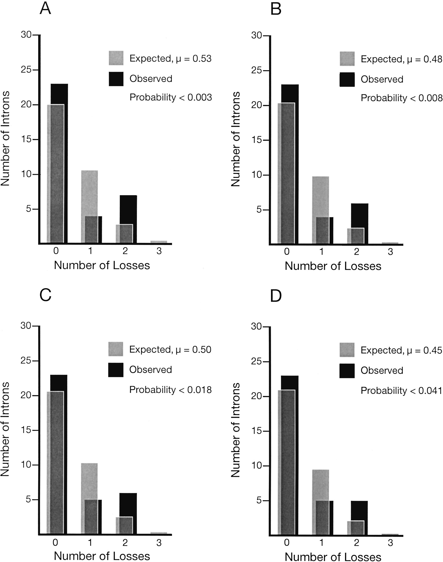 (A) Model 1. (B) Model 2. (C) Model 3. (D) Model 4. Introns are not lost randomly. The four models are described in Table 3. However, as Models 2 and 4 assume that cpb-2 intron #2 was created sometime after the split between the ancestor of C. japonica and that of the other species, this intron was excluded from the calculations, leaving only 33 ancestral introns in the data set for these two models. This correction allowed us to consider only introns that have existed for the same length of time.