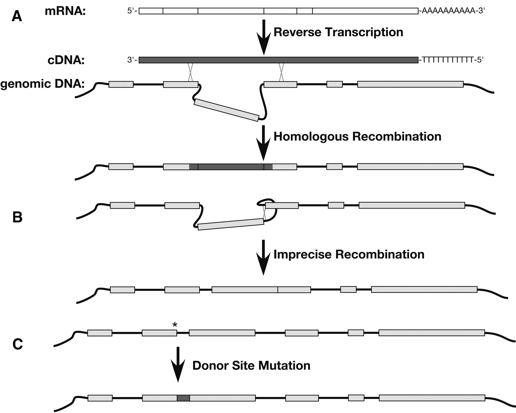 Mechanisms of intron loss. (A) Loss by recombination with cDNA. In the genomic DNA, coding sequences are shown as gray boxes. Sites of recombination are marked with an X. (B) Loss by deletion. Only one of several possible mechanisms for deletion is shown. (C) Loss by mutation of the donor site. (*) The site of a point mutation that destroys the donor site. The dark gray box indicates in-frame intron sequences that have become part of the coding sequence.