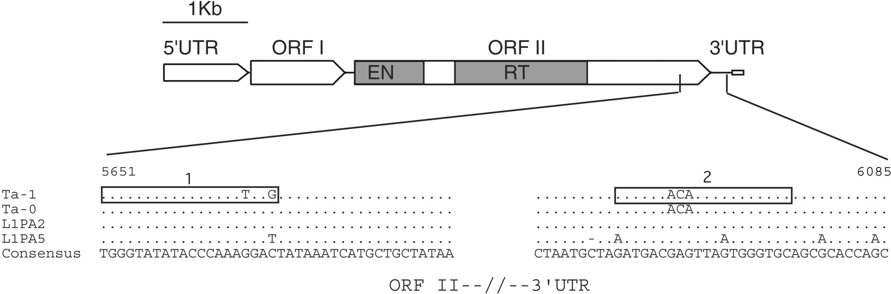 Structure of a typical full-length human L1 element. The 5′ untranslated region (UTR) has a regulatory function; open reading frame 1 (ORF I) encodes an RNA-binding protein; ORF II encodes the L1 replicase and contains an endonuclease (EN) and a reverse transcriptase domain (RT), and the 3′ UTR that contains a conserved G-rich polypurine motif. Genomic copies of L1 usually end in an A-rich stretch (open rectangle, see Moran and Gilbert 2002). The partial alignment of Ta-1, Ta-0, L1PA2, and L1PA5 consensus sequences shows the positions of oligonucleotide 1, which is specific for Ta-1, and of oligonucleotide 2, which includes the ACA trinucleotide, diagnostic of the Ta family (see Methods). The numbers indicate the position of the sequence on alignment ALIGN-000165 at the EMBL_ALIGN database (Boissinot and Furano 2001).
