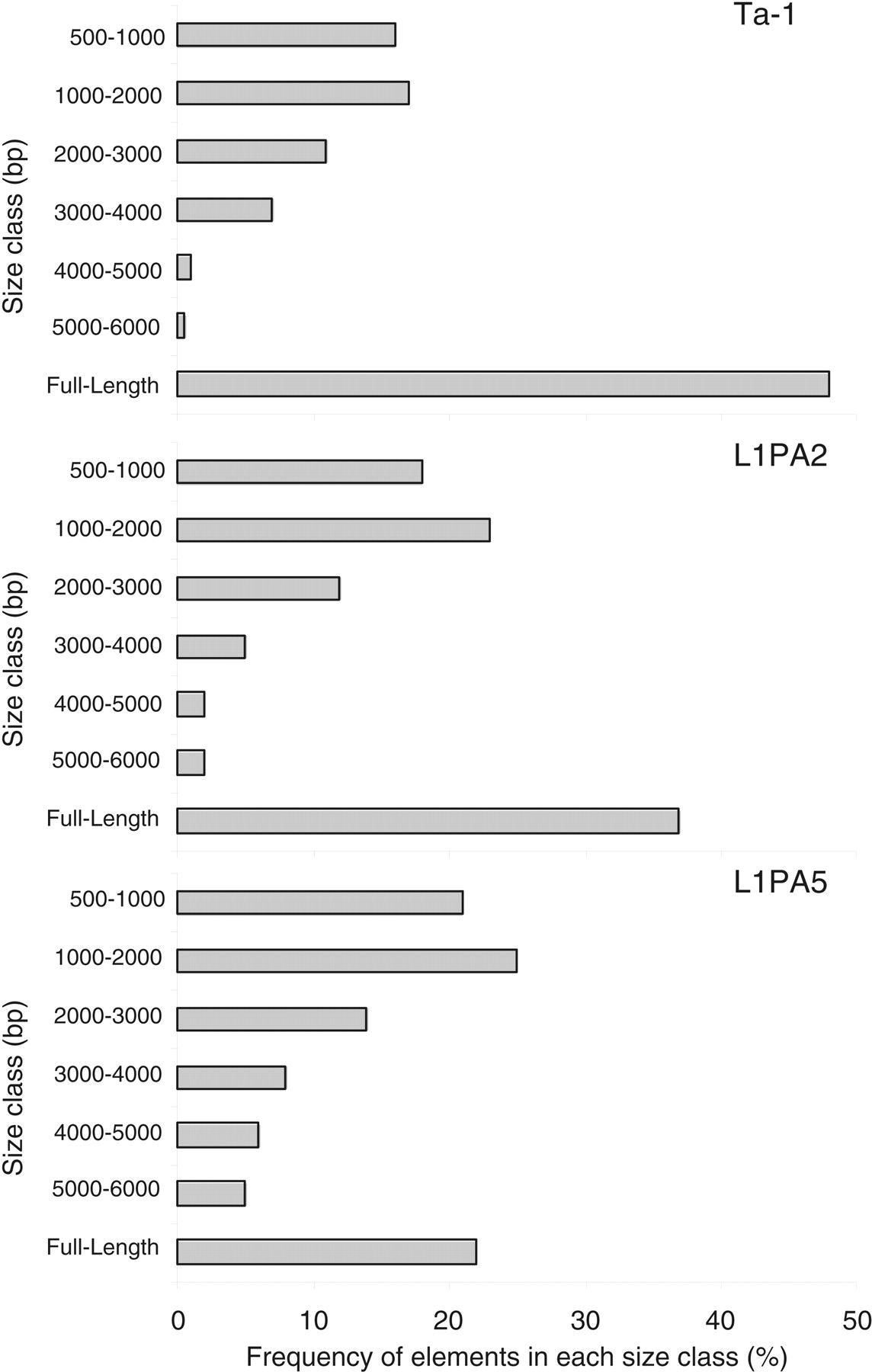 Size distribution of autosomal L1 elements. Elements are grouped in 1000-bp intervals except for the smaller class that shows the frequency of elements 500–1000 bp long. The number of elements analyzed was 183 Ta-1 elements (those whose size was known from the human genome data base), 282 L1PA2 elements, and 305 L1PA5 elements.