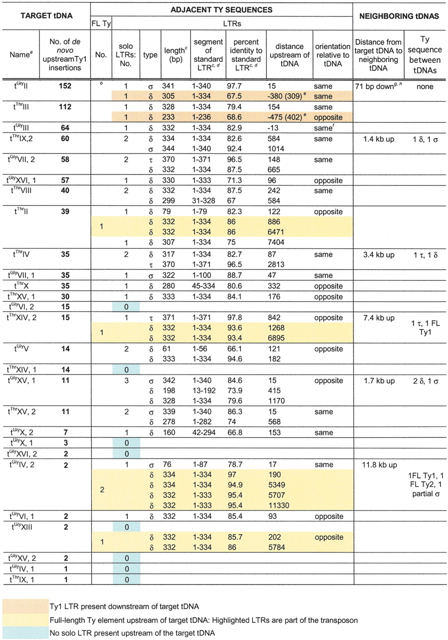 tDNA Targets and Surrounding Full-Length Ty Elements, LTR, and tDNAs, Grouped and Listed in Order of Ty1 Target Preference