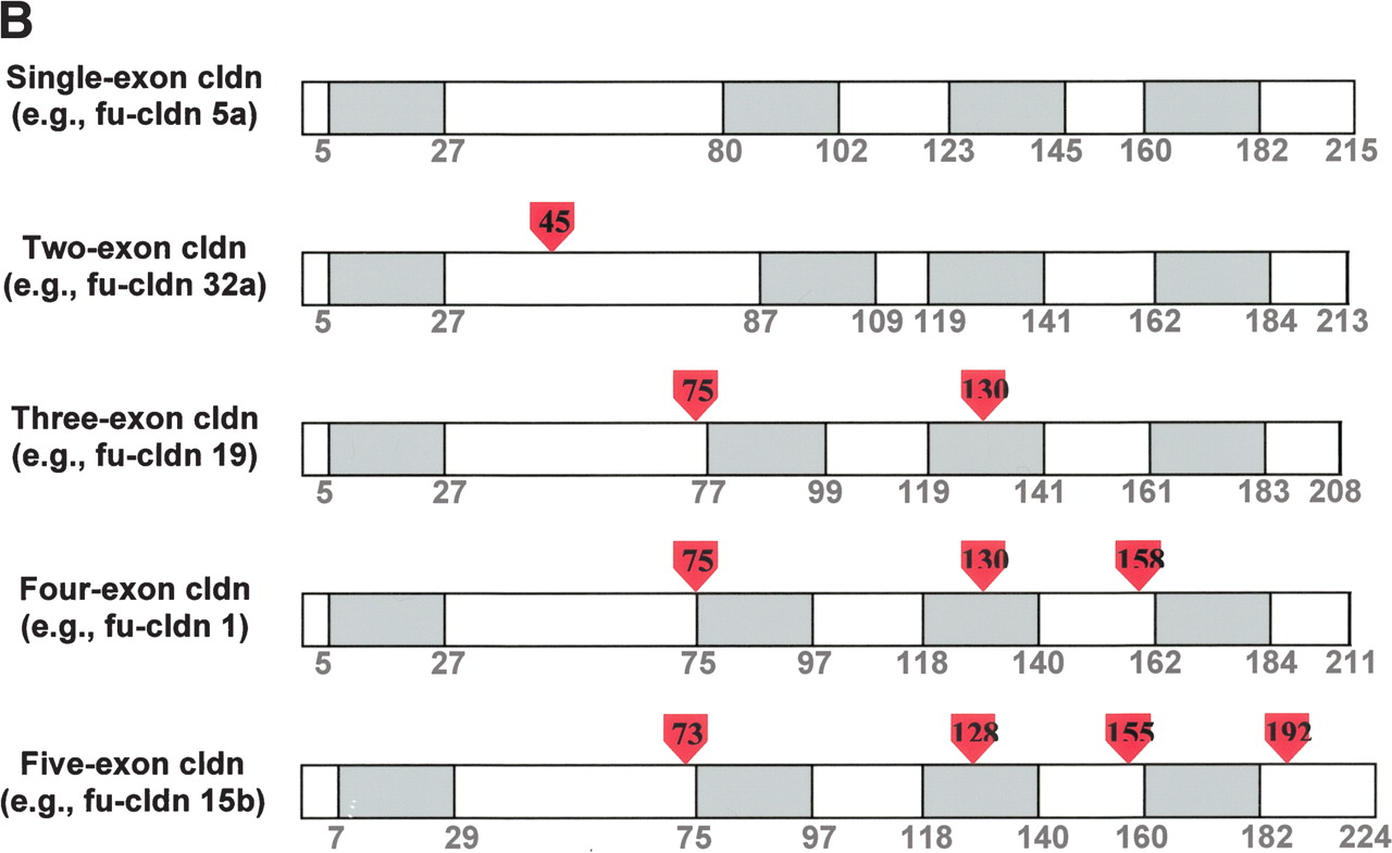 Topology and exon–intron organization of Fugu claudins. (A) Membrane topology of claudins. A diagram of the typical topology of claudins in the lipid bilayer and their location at the tight junction between the apical and lateral plasma membrane of epithelial cells is shown. (B) Exon–intron structure of typical Fugu claudin genes. The approximate location of introns in claudin genes encoded by one, two, three, or four exons is shown based on a typical example. Amino acids are numbered and show the boundaries of the four transmembrane domains (shaded in gray), which are typical for claudins. Intron position is shown by the red arrowheads (the numbers within correspond to the location in relation to the amino acid sequence).