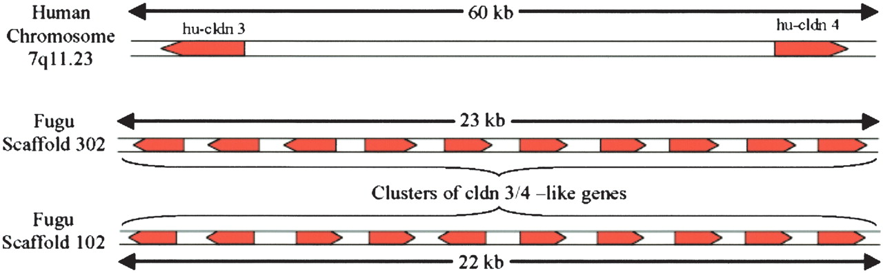 Extensive duplication of an ancestral claudin 3 and 4 gene in Fugu. The human CLDN3 and CLDN4 locus on Chromosome 7 is compared with the cldn3/cldn4-like gene loci on scaffolds 102 and 302 of Fugu. The location and orientation of the genes are indicated.
