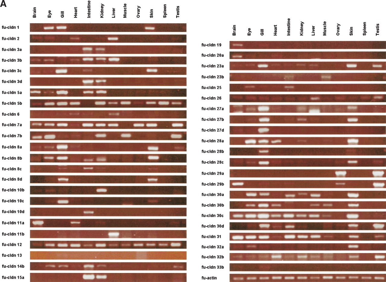 Expression profiling of the Fugu claudin genes. Expression of the different claudin genes in (A) adult tissues and (B) an early somite embryonic stage of Fugu was analyzed by semiquantitative RT-PCR. The amplification of fu-actin was monitored as a positive control.