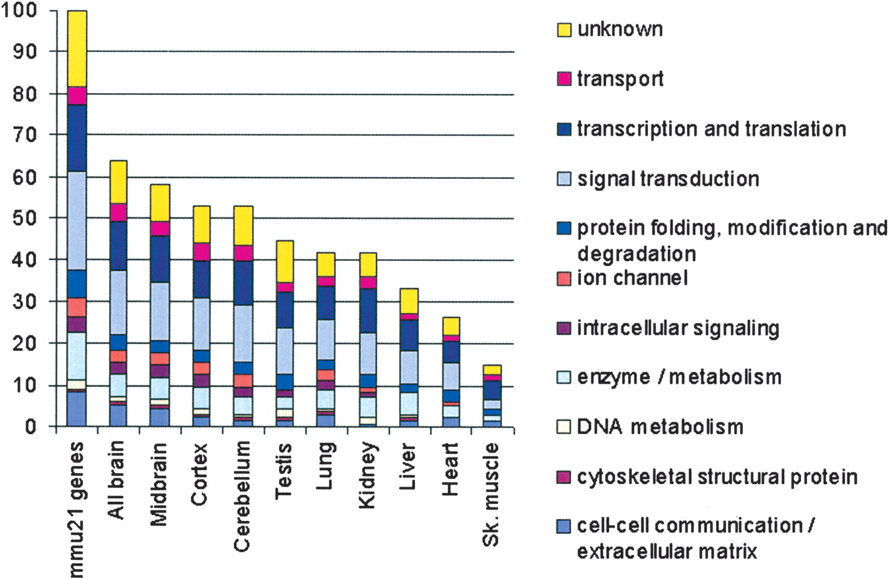 Functional distribution of the 136 mmu21 genes in nine tissues of euploid mice. The 136 Chr21 orthologs (mmu21) were distributed into 10 categories of biological processes (left bar; Hill et al. 2002). Bars show the functional distribution of the genes expressed in each tissue, as percent of the total number of mmu21 genes. The second left bar (all brain) represents the accumulated data from the three brain regions.