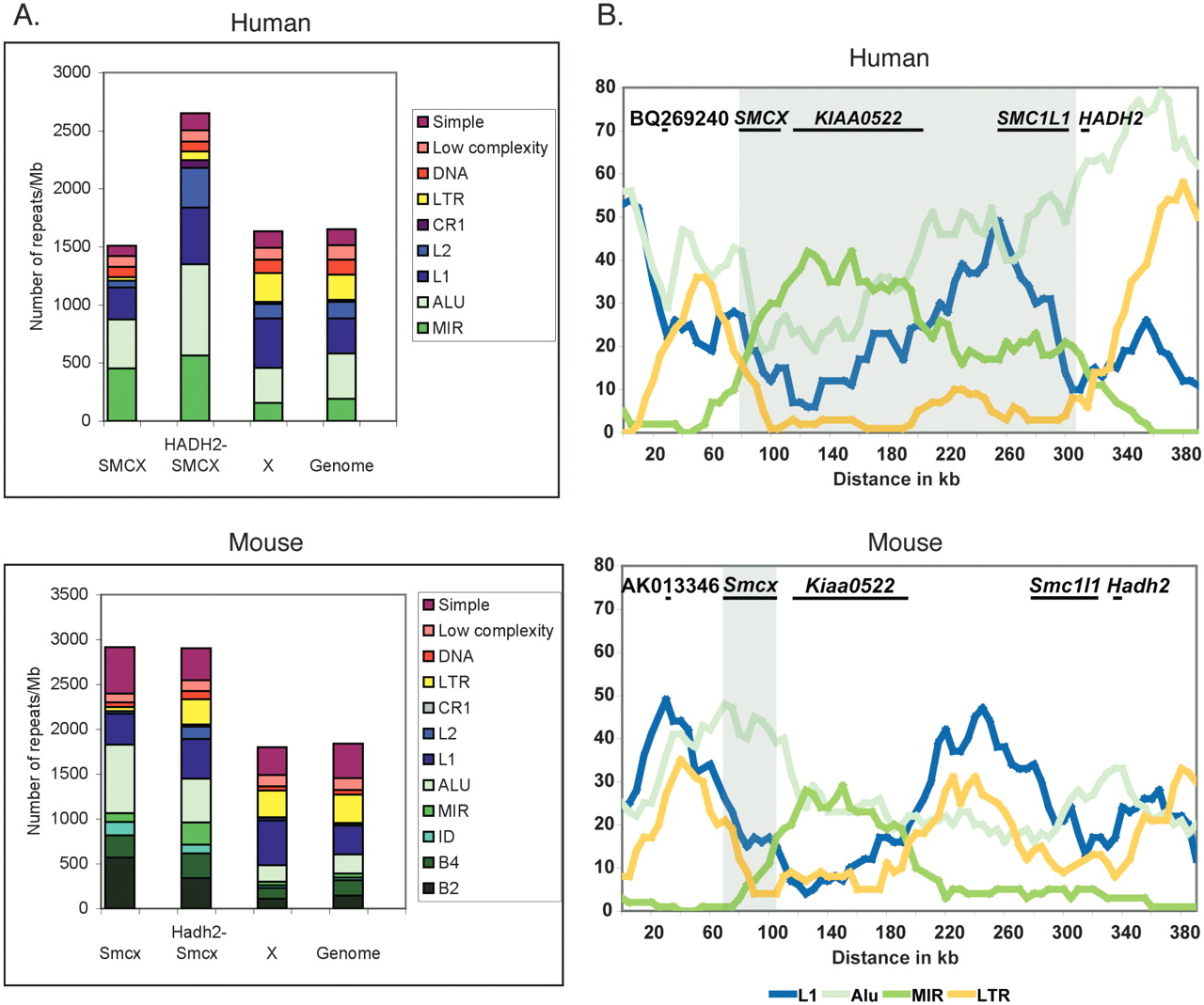Repetitive DNA content in the domain of escape. (A) Number of repetitive elements in the SMCX/Smcx gene region, the remainder of the human escape domain (between SMCX and HADH2, these two genes being excluded) and the equivalent mouse region, the whole X-chromosome, and the entire genome (see Table 2). Repeats are displayed as number normalized per megabase of DNA. (B) Sliding-window analysis of the distribution of repeats across the region of escape (shaded) and flanking inactivated regions.