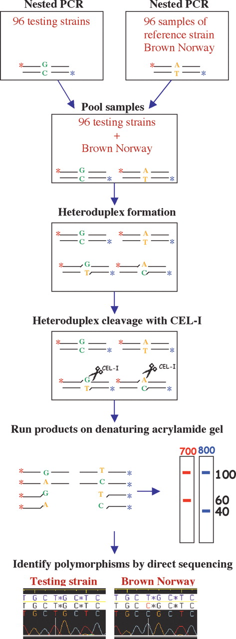 Schematic overview of the polymorphism discovery strategy. PCR on genomic DNA of 96 testing strains and on a set of 96 samples of the reference strain Brown Norway (BN/Cl) produces two sets of 96 PCR products that contain different fluorescent labels at either end (IRD700 and IRD800, indicated by red and blue stars). Pooling of tester samples with reference samples, followed by denaturing and reannealing, results in the formation of heteroduplex DNA in the case of polymorphisms between the strains used. Heteroduplex DNA is specifically cleaved by the CEL I nuclease at the site of the mismatch and the resulting fragments are separated on a denaturing polyacrylamide gel with fluorescence detection. Subsequently, representative samples for a specific polymorphism are sequenced to reveal the molecular nature of the polymorphism.