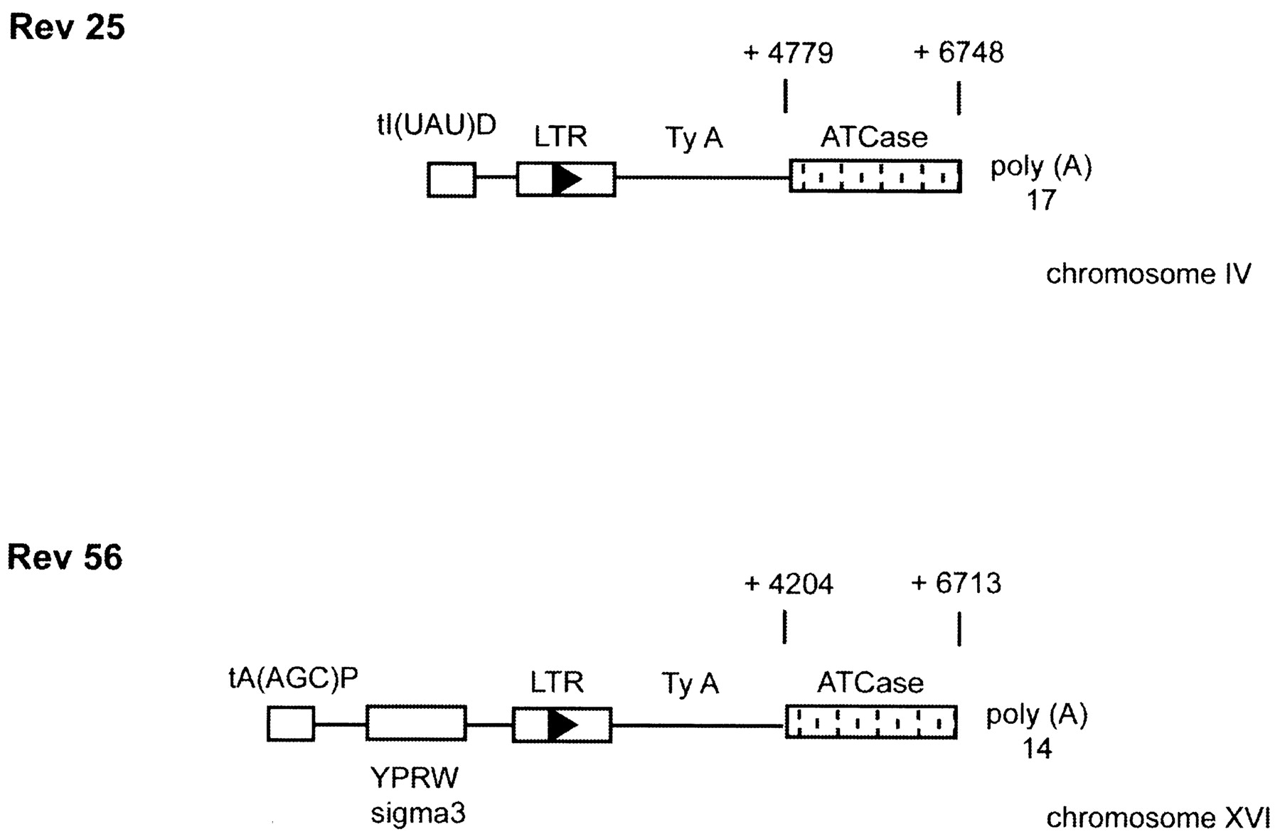 The 5′ region situated downstream the Ty sequences of the Rev 25 and Rev 56 spontaneous revertants were analyzed. The boxed arrowheads indicate Ty LTRs and the direction of the Ty transcription. In the URA2 structure, the nucleotide locations of the beginning and the end of the duplicated region are given, position +1 being the A nucleotide of the ATG initiator codon of the URA2 gene.