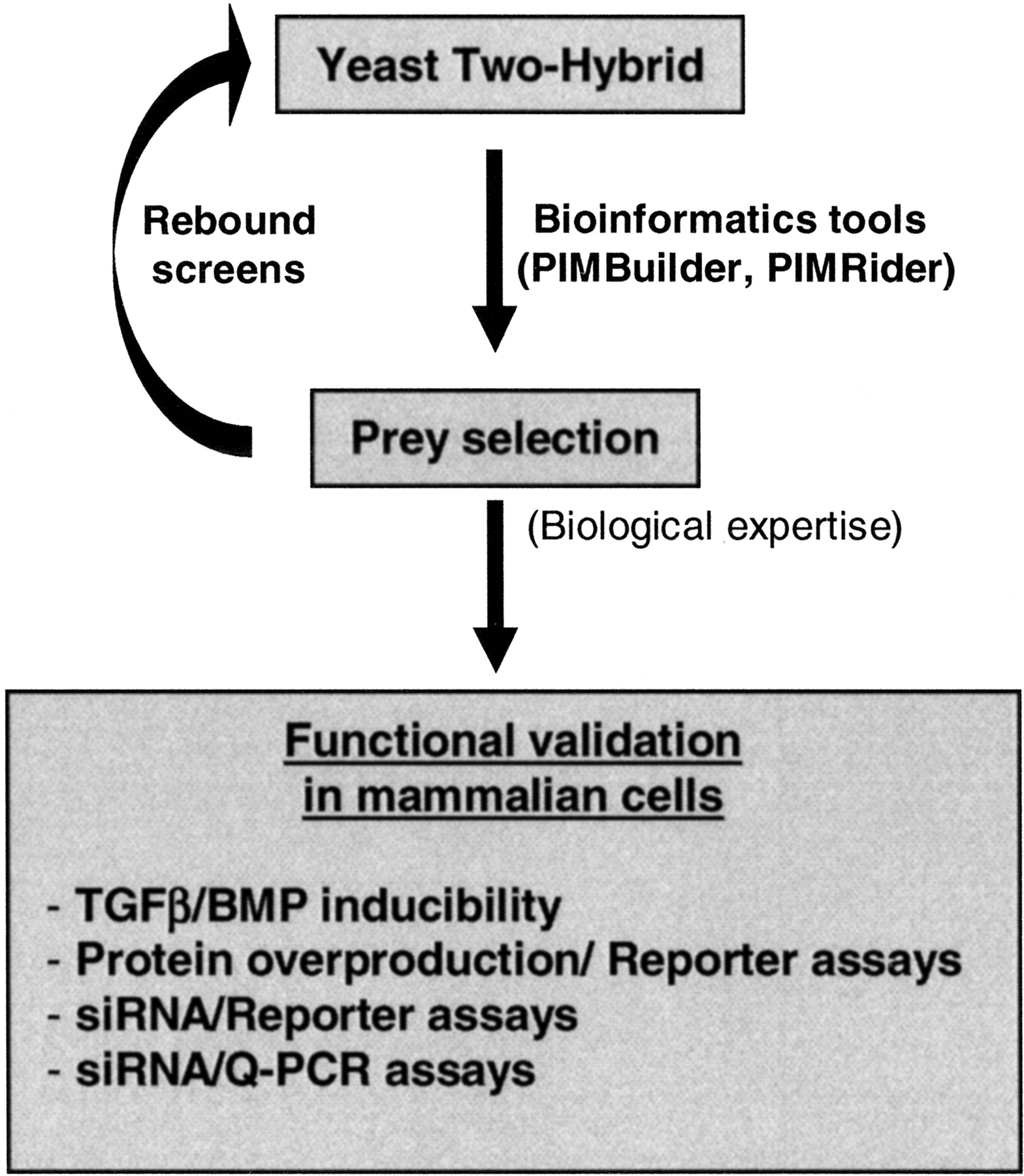Strategy for unraveling interactions between components of the Smad pathway. This figure describes the global process from our large-scale yeast two-hybrid screening to the general functional validation assays in mammalian cells. Preys were selected by use of bioinformatics tools (PIMBuilder, PIMRider) and biological expertise.