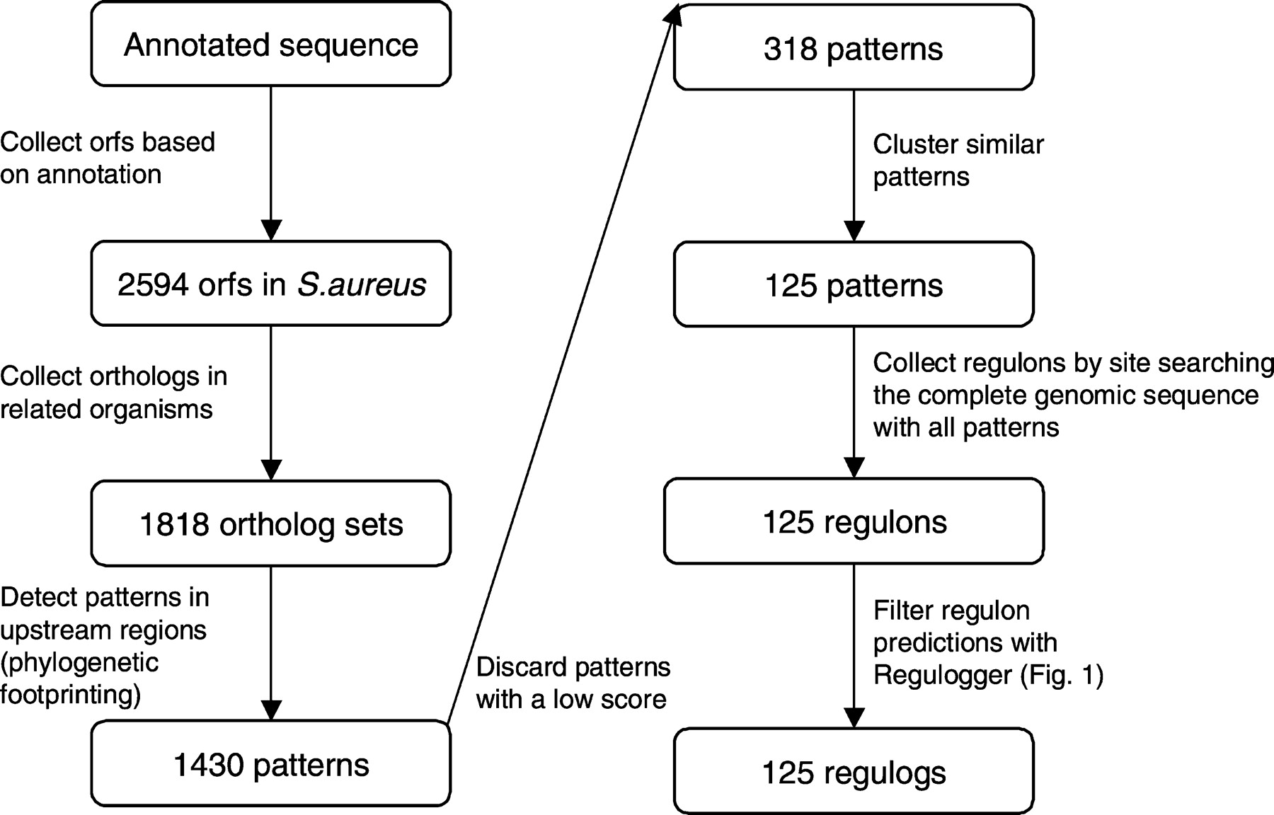 Schematic representation of the strategy to identify regulogs in S. aureus. From the genomic sequence, protein-coding regions are identified. For all proteins, orthologs in other genomes are defined. These ortholog sets are used for phylogenetic footprinting, in which Gibbs sampling is run on upstream regions of sets of orthologous genes to obtain putative regulatory motifs (e.g., binding sites). Low-scoring patterns are filtered and patterns with similar sequences are clustered. For each pattern, the putative regulon in S. aureus is defined. These predicted regulons are filtered with the Regulogger method described in Figure 1. This produces a set of regulogs, conserved regulons, in S. aureus.