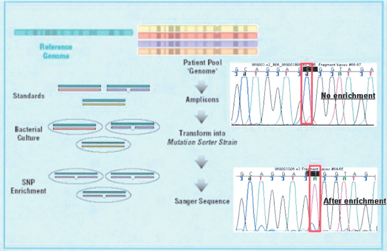 A schematic of the MRD SNP discovery process. Genomic DNA samples are pooled together, and PCR amplicons are generated by using the pooled genomic DNA as a template. If this PCR product was simply sequenced, the SNP shown would be lost in the noise of sequencing (top trace). The various amplicons (each amplified by using the genomic pool sample as a template) are pooled and hybridized to standards and transformed into the specifically designed mutation sorter strain. The fragments containing mismatches between the test sequence and the standard grow preferentially. This variant-enriched pool is then used as a template for PCR amplification and sequencing of the various amplicons. As seen when comparing the top and bottom traces, the minor allele becomes dominant after enrichment. Of note is that the frequency of this SNP is 15% in the tested population, as estimated by peak height as previously described (Kwok et al. 1994).