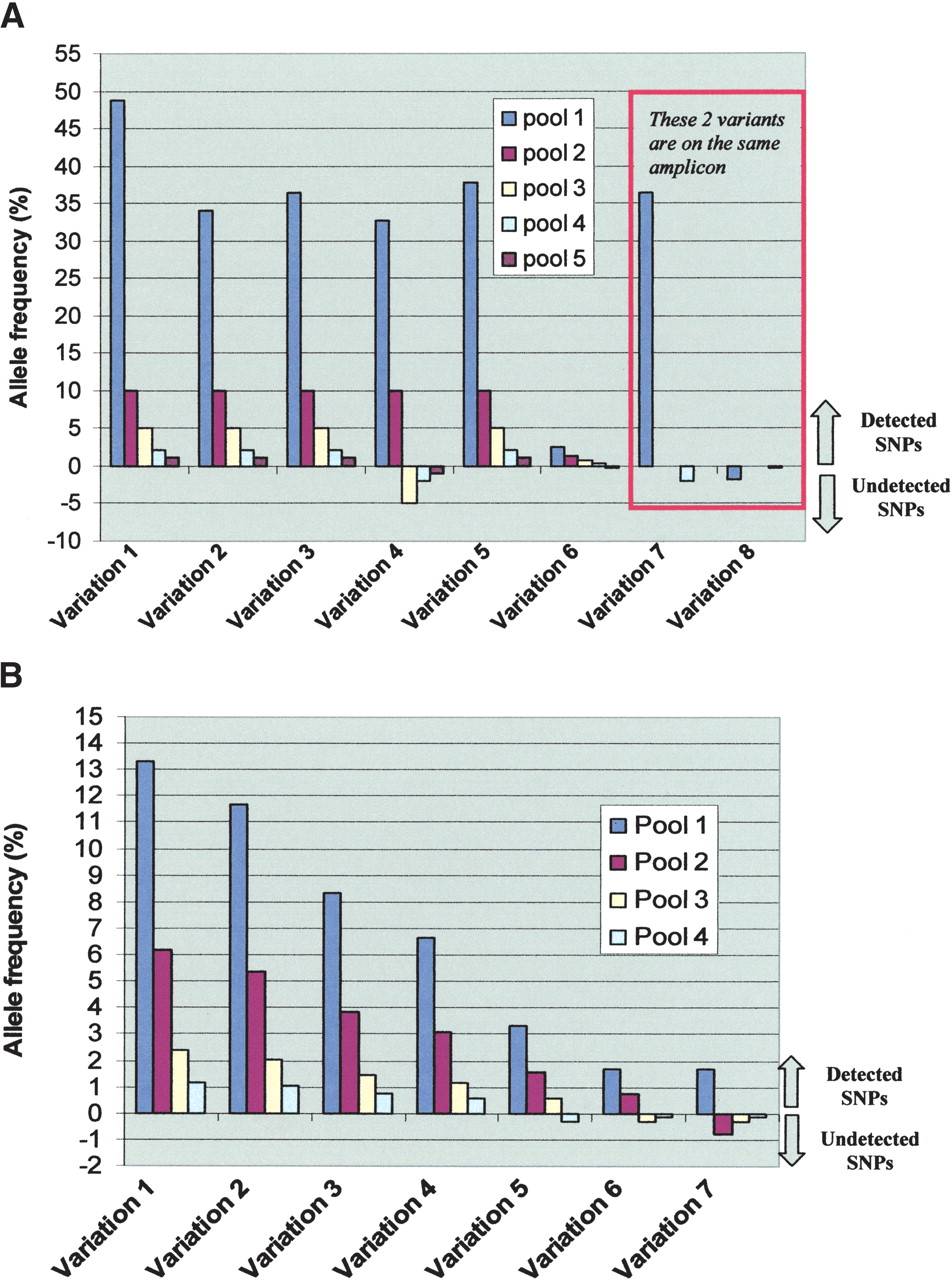 Detection of the various SNPs in the study. (A) Detection of known SNPs. This panel depicts the allele frequency (y-axis) of the seven detected variations in the four constructed genomic mixtures (x-axis) with data from each pool represented with a different color. Pool 1 is where all 94 samples are mixed. The other four pools are different mole DNA dilutions of the five-genome pool. To distinguish SNPs that were detected from those that were not detected in a particular genomic mixture in the MRD-based SNP discovery, we depict the undetected SNPs with negative allele frequency. Variations 7 and 8 are in the same amplicon. Sequence data for this amplicon was obtained for only two pools. Data from pool 1 of this amplicon demonstrates how the presence of a common variant (variation 7) masks other rare variant(s) (variant 8) in the same amplicon. (B) Detection of unknown SNPs. This panel depicts the allele frequency (y-axis) of the seven detected variations in the four constructed genomic mixtures (x-axis) with data from each pool represented with a different color. The four pools shown are for the different mole DNA dilutions of the five-genome pool. To distinguish SNPs that were detected from those that were not detected in a particular genomic mixture in the MRD-based SNP discovery, we depict the undetected SNPs with negative allele frequency. Some variations are detected when present at frequency as low as 0.5%.