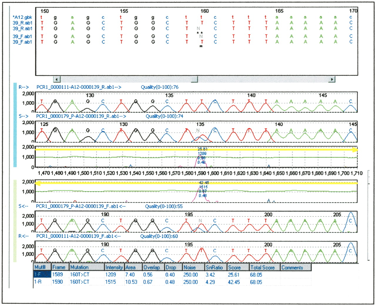 Sequencing traces allowing detection of 1% allele. This is an example of the enrichment of 1% allele detected by the mutation surveyor software (variation 1 in Fig. 4A). The top two traces are the forward traces from the standard and the variant-enriched pool, and the bottom two traces are the reverse traces. The letters R and S in the left side of each trace denote the standard and variant-enriched pool, respectively. The middle traces are the software graphical representation of the “difference” between the traces. At the top, the sequence of the traces (uppercase letters) are aligned with the public database sequence (lowercase letters), allowing the localization of the variation.