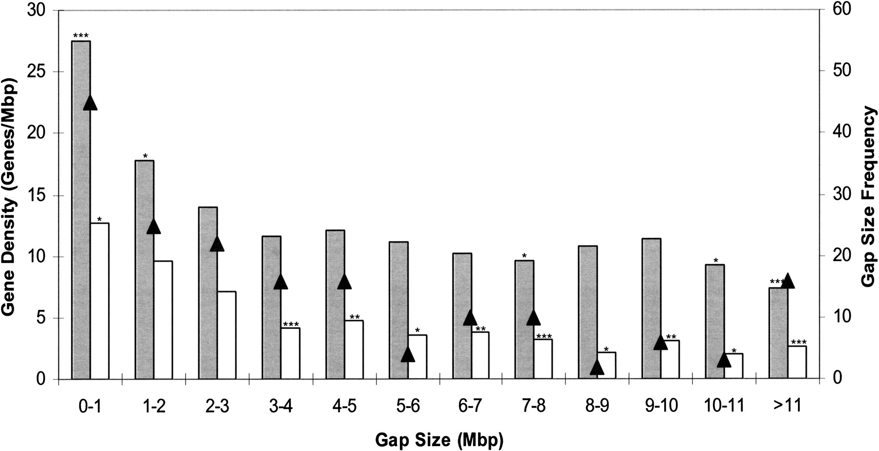 Gap size distribution and gene density within gaps on the cattle–human comparative map. The frequency of gaps of different sizes is indicated on the figure by “▴”. Gene density was determined as described in Methods. Shaded bars indicate known and predicted genes (NCBI build 33); clear bars are RefSeq genes (NCBI release 1). Asterisks above the bars indicate the significance level of the comparison of gene density to the genome-wide average (*, P < 0.05; **, P < 0.001; ***, P < 0.0001). Gap sizes include those gaps in the comparative map that correspond to chromosome rearrangements, excluding boundaries at conserved telomeres and around centromere insertions.