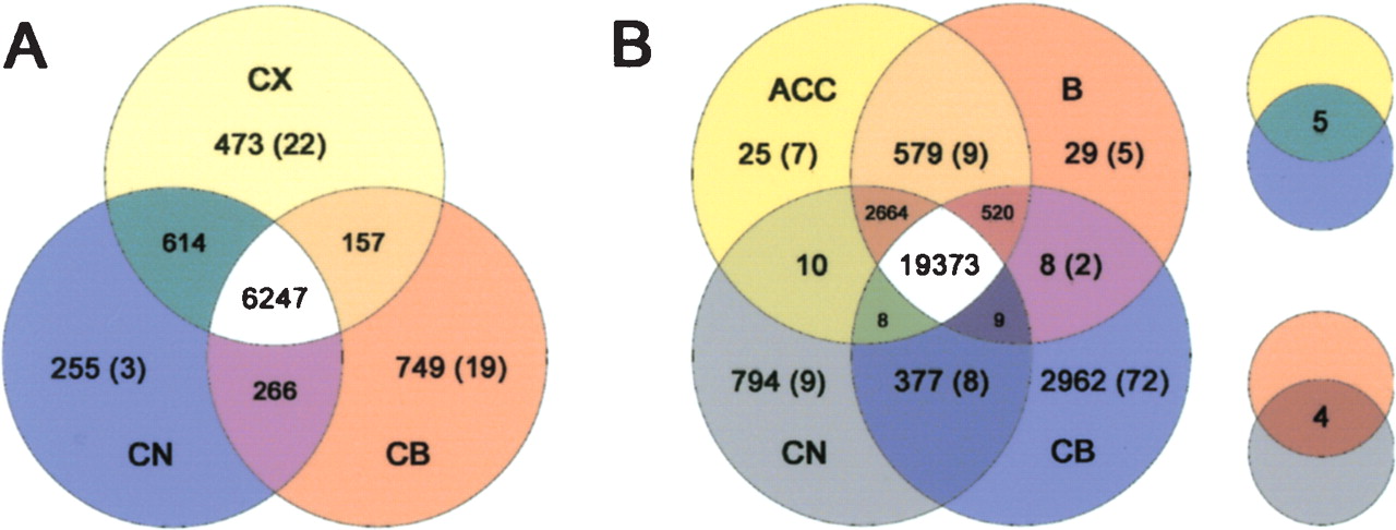 Number of genes exhibiting expression patterns specific to brain regions in humans and chimpanzees. (A) Genes with region-specific expression among the cerebral cortex (CX), the caudate nucleus (CN), and cerebellum (CB). Genes with expression specific for the cerebral cortex were defined as not showing any significant difference among the four cerebral cortex regions but significant differences to both the caudate nucleus and the cerebellum in at least one of these four regions. The numbers of genes with correlation coefficients <0.6 between human and chimpanzee brain expression profiles are shown in parentheses. (B) Genes with region-specific expression among four brain regions in a broader analysis of the transcriptome including the anterior cingulate cortex (ACC) and Broca's area (B).
