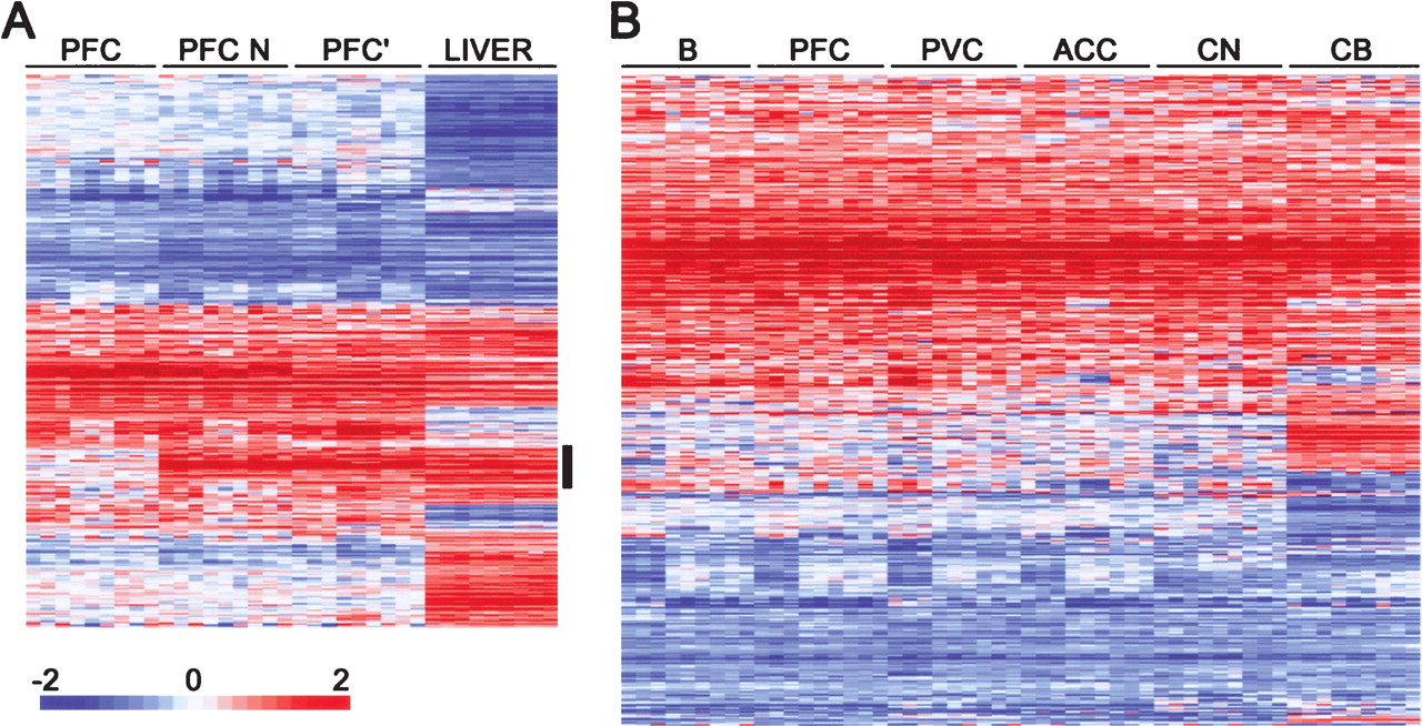 Gene expression differences between humans and chimpanzees. (A) Hierarchical clustering of expression differences between humans and chimpanzees in the prefrontal cortex in the current data set with (PFC) and without (PFC N) masking of the sequence differences between the species and previously published prefrontal cortex (PFC′) and liver data (Enard et al. 2002). All genes differentially expressed in at least one tissue and detected in the other one are shown. The vertical black bar indicates the cluster of expression differences that disappears after the masking procedure. (B) Hierarchical clustering of genes classified as differentially expressed between humans and chimpanzees in at least one out of six studied brain regions. Each row represents a gene and each column represents a pairwise comparison between one human and one chimpanzee in a given tissue. The magnitude of expression differences is shown as the base two logarithm of the ratio of the gene expression level in humans to the one in chimpanzees. Higher expression in humans is shown in red and higher expression in chimpanzees in blue, with color intensity being proportional to the magnitude of the expression difference as indicated by the color bar at the bottom of the figure. (B) Broca's area; (PFC) prefrontal cortex; (PVC) primary visual cortex; (ACC) anterior cingulate cortex; (CN) caudate nucleus; and (CB) cerebellum.