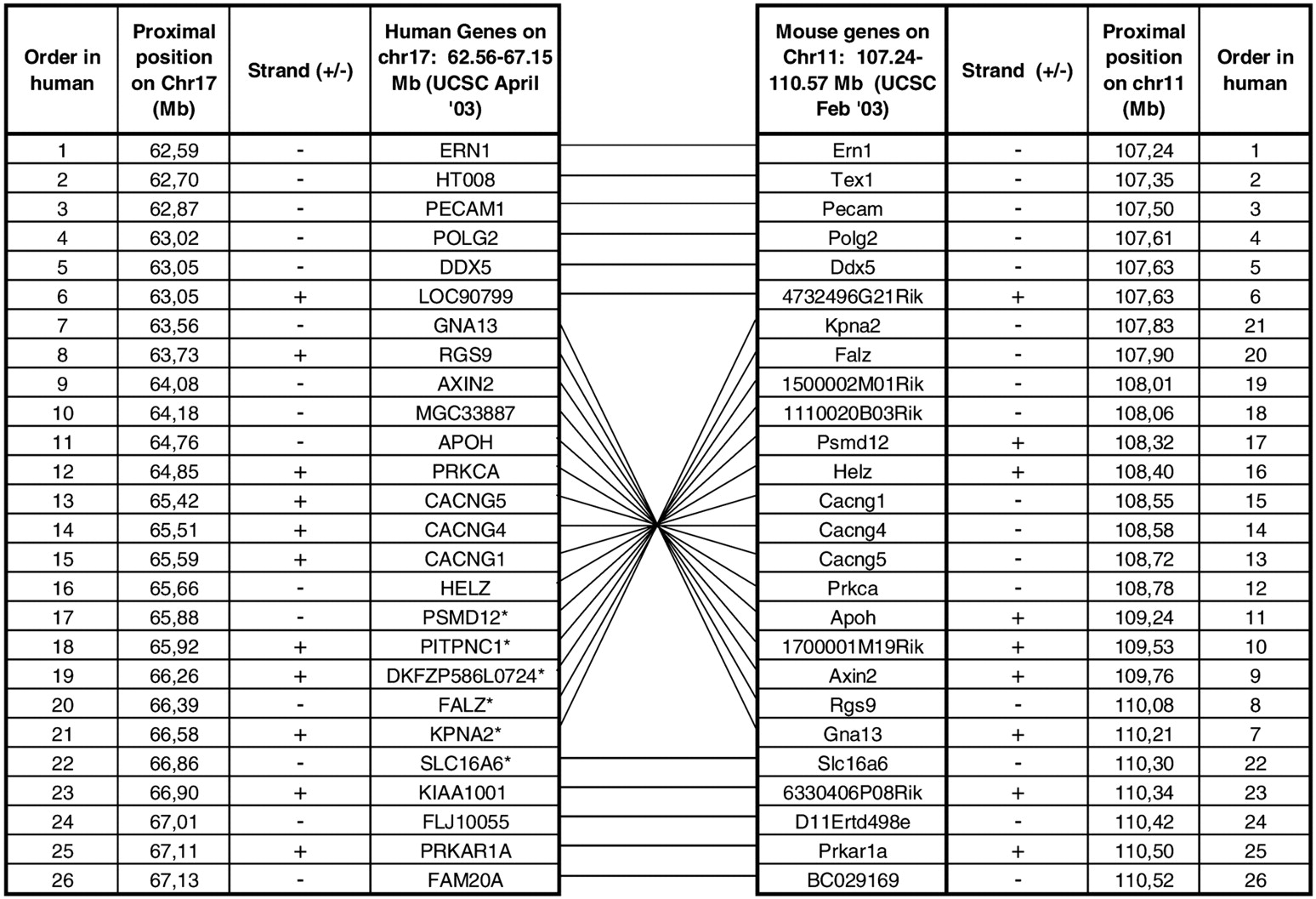 Comparison of the organization of the human Chromosome 17q22–24 region and the syntenic region on mouse Chromosome 11. The crossing lines indicate that the genes on mouse Chromosome 11 are in an inverted order compared with human Chromosome 17. The inverted region represents the shared haplotype region in MS. Only those human genes that have a mouse ortholog in the syntenic region of mouse Chromosome 11 are listed.