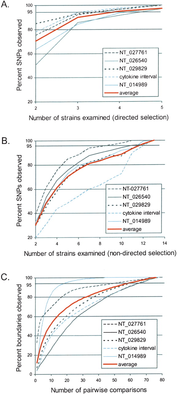 The number of strains required to capture >95% of the observed variation was calculated both by determining how many of the 13 inbred classical strains were needed to detect >95% of the SNPs (A,B) and by determining how many of the 78 pairwise comparisons of the inbred classical strains were needed to observe >95% of the segmental block boundaries (C). (A,B) The percent of SNPs observed versus the number of inbred classical strains examined was determined for each contig individually as well as the average across all five contigs. (A) Directed selection of strains based on their level of divergence (based on the Kimura 2-parameter distance), starting with the most divergent. (B) The selection of inbred strains was random (nondirected selection), with the process being repeated 100 times, and the average results for each contig and across all five contigs shown. (C) The percent of segmental boundaries observed versus the number of inbred classical pairwise comparisons examined is shown for each contig individually as well as the average across all five contigs. Intervals containing relatively few segmental blocks, such as NT_014989, require fewer pairs of strains, and intervals containing an above-average number of segmental blocks, such as NT_026540, require more pairs of strains.