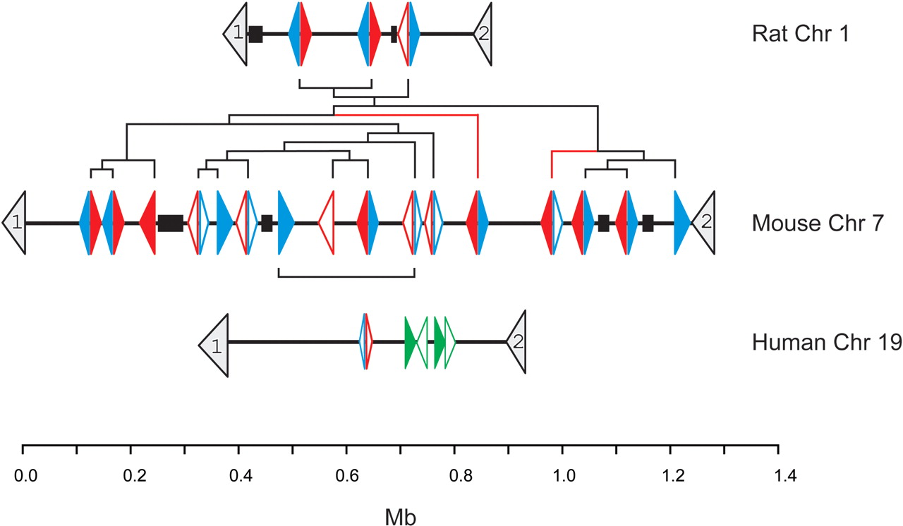 A graphical representation of the relative position and transcriptional orientation of the Abpabg-like genes and pseudogenes located on Rattus norvegicus Chromosome 1, Mus musculus Chromosome 7, and Homo sapiens Chromosome 19. Coordinates are taken from genome releases rn3 (Baylor RGSC v3.1), mm3 (NCBI build 30), and hg16 (NCBI build 34), respectively. The 5′-to-3′ orientations of the genes are shown by the direction of the arrowheads. Scn1b and Uble1b genes, which lie in orthologous genomic regions in all three species, are numbered 1 and 2, respectively. Abpa-like genes are shown in blue, Abpbg-like genes in red, and primate SCGB4A1–4(P) genes in green. Filled arrowheads represent predicted functional genes whereas open arrowheads denote predicted pseudogenes. The sequence of duplication events among rodent genes inferred from phylogenetic trees (see text) is implied from the dendrogram, shown in black. Blue and red lines in this dendrogram represent branches that are not supported by the phylogenetic trees shown in Figure 3 (see text). The scale bar shows approximate genomic distance in megabases. Gaps (>5 kb) in the genomic assembly of each species are shown as black boxes.