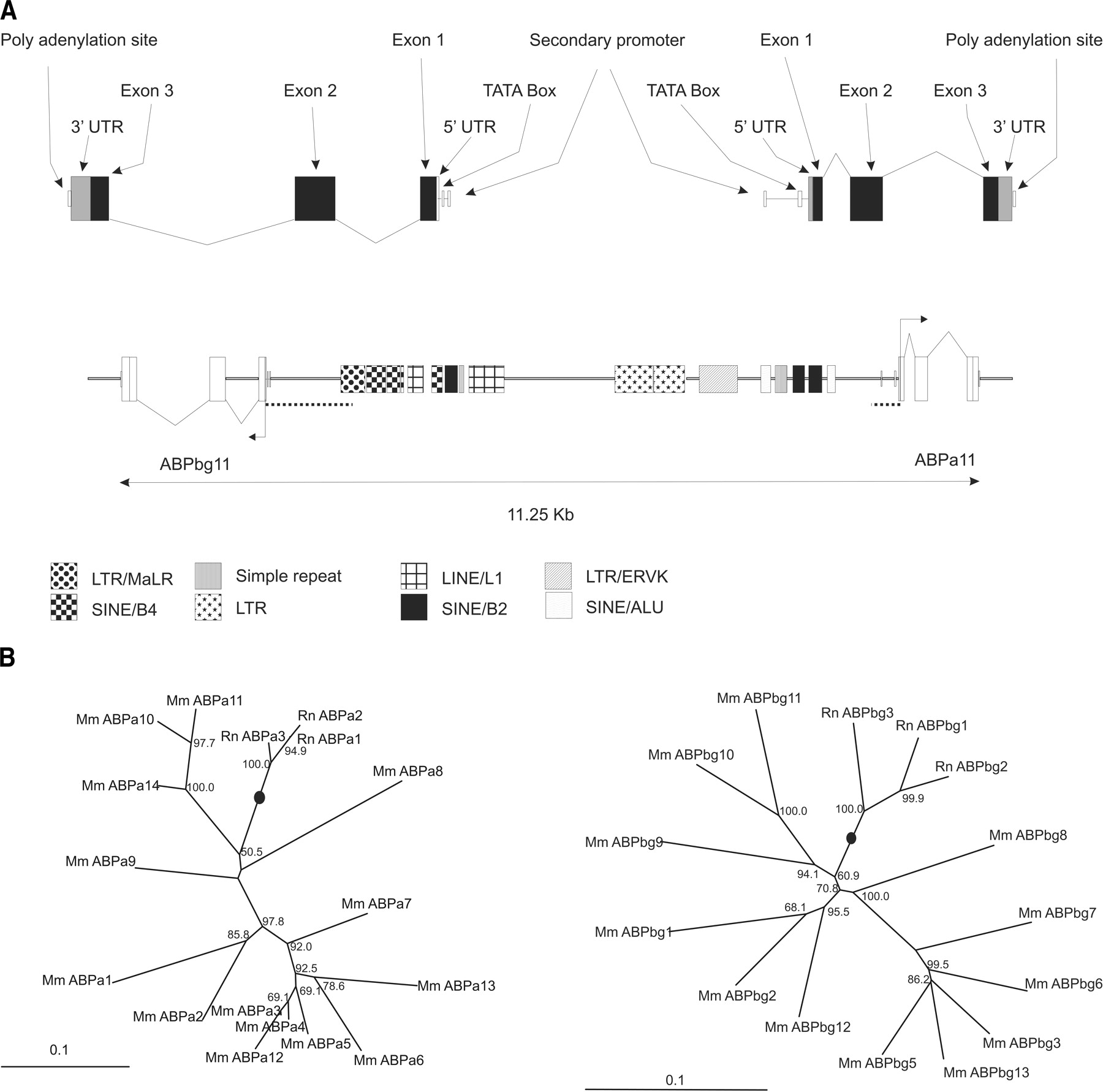 (A) Schematic representation of gene structures and repeat elements between the Abpa11 (Abpa) and Abpbg11 (Abpb) gene pair. The position and size of genes and repeat elements are shown to scale. Coordinates were obtained from the genome browser at UCSC (Kent 2002). The upper portion of the figure shows the genomic architecture of Abpa11 and Abpbg11 genes in greater detail. Highlighted regulatory elements correspond to those described previously (Laukaitis et al. 2003). The dashed lines represent the upstream regions used to generate the 5′ phylogenetic trees shown in B. (B) 5′ trees: phylogenetic relationships of rodent Abpa-like and Abpbg-like genes. Repeat-masked genomic DNA sequences 5′ upstream of Abpa-like genes and Abpbg-like genes were aligned (see Methods). For Abpa-like and Abpbg-like genes, 300 bp and 1 kb, respectively, 5′ to the translational start site were used for generation of the trees. Trees were generated using the neighbor joining method. The lineages containing the proposed roots of the trees are shown by black dots. Bootstrap values >50% are shown.