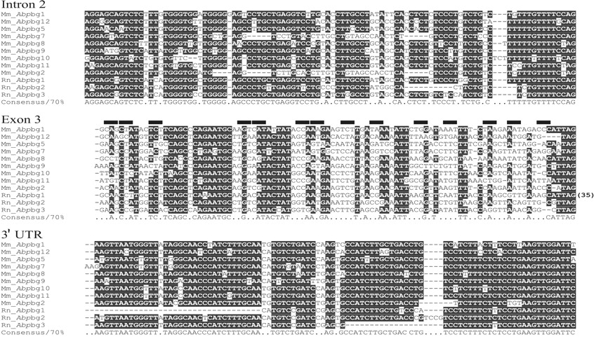 Multiple nucleotide sequence alignment of mouse and rat Abpbg-like exons 3 and surrounding genomic DNA. Genomic DNA corresponding to exon 3 (98 positions) and 100 nucleotide positions of both flanking intronic and 3′-UTR sequence was aligned with HMMER, and manually adjusted. We found that 81.3%, 50.5%, and 92.6% of the sites in the intron, exon, and 3′-UTR, respectively, exhibited ≥70% consensus. In these calculations, positions with fewer than 50% gaps were considered. The 14 codons of exon 3 corresponding to predicted ω+ sites are shown by horizontal bars.
