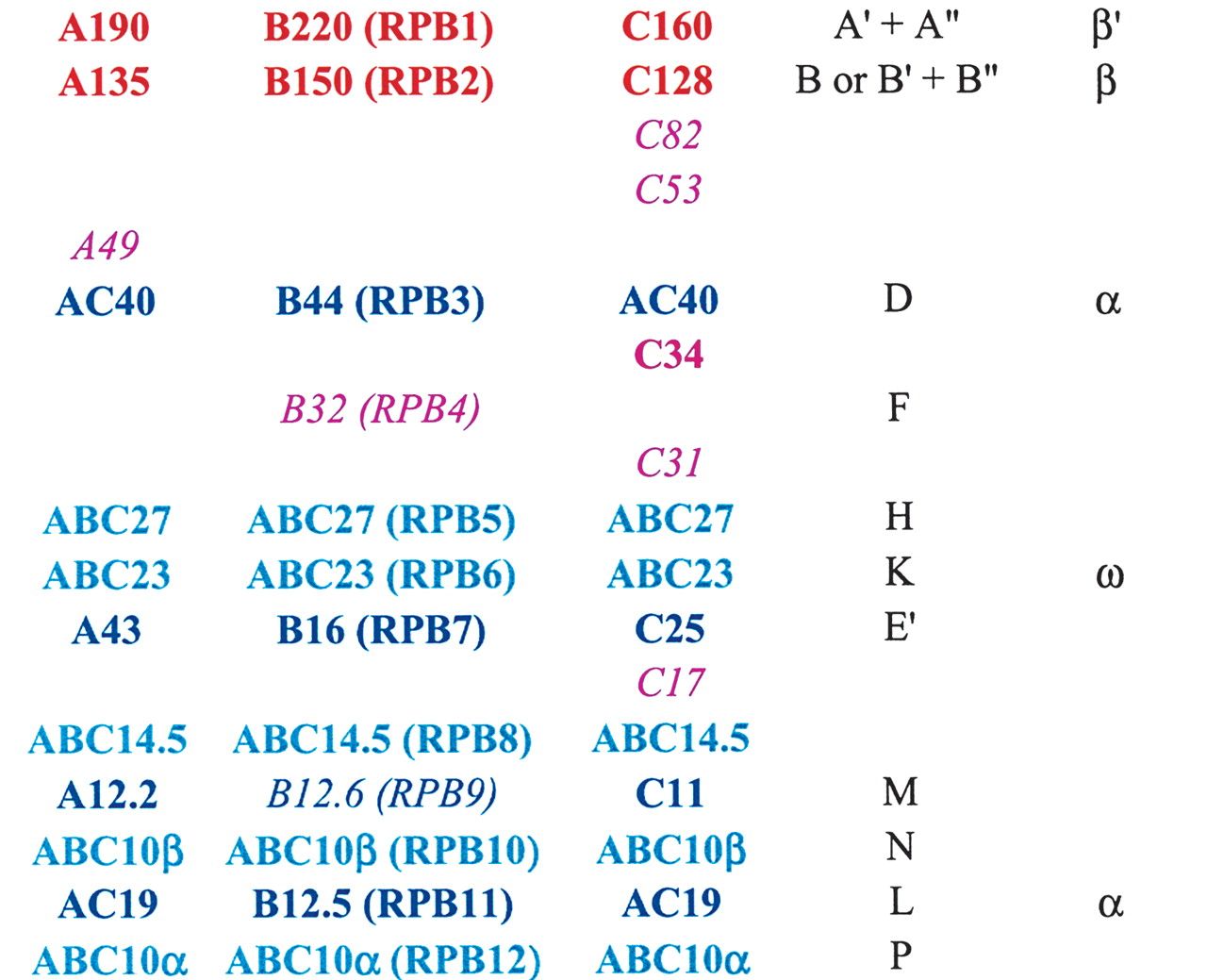 RNA Polymerase Subunit Correspondencesa