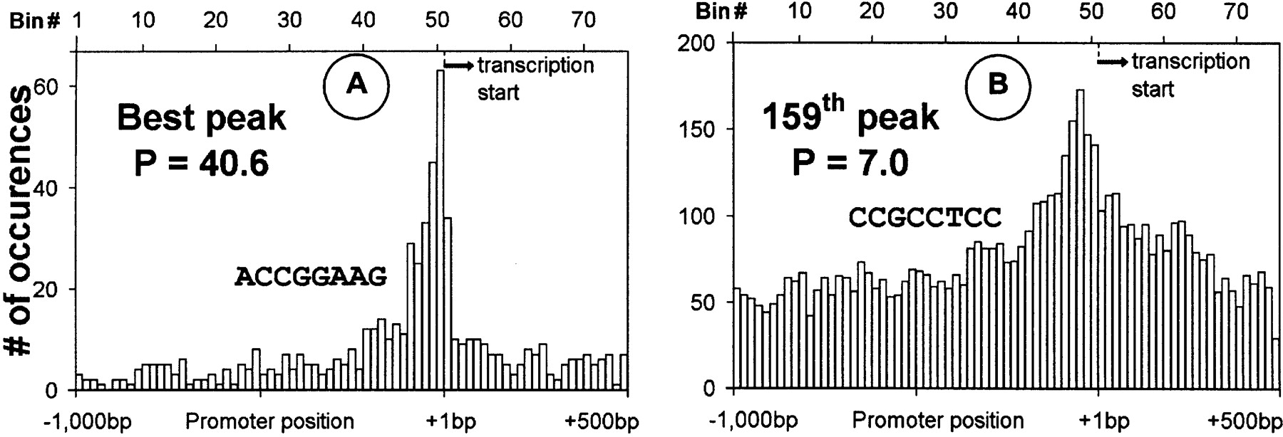 Distribution (number of occurrences per bin as a function of position relative to the TSS) of the DNA 8-mer (ACCGGAAG) that shows the greatest clustering (A) and the 159th 8-mer (CCGCCTCC; B).