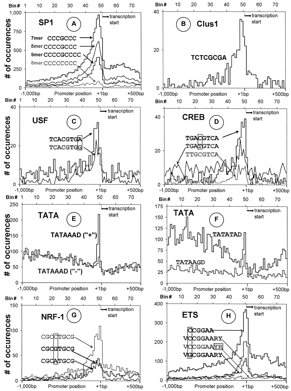 Distribution of selected sequences (8-mers and consensus patterns). (A) Three SP1 (CCCGCCC, CCCCGCCC, CCCCGCCCC) sequences and a nonpeaking single base variation (CCCCCCCC). (B) Clus1 (TCTCGCGA) sequence. (C) Two USF (TCACGTGG, TCACGTGA) sequences. (D) Three (TGACGTCA, TGATGTCA, TTGCGTCA) CREB like sequences. (E) Strand-specific localization of the TATAAAD sequence. (F) Two variants (TATATAD and TATAAGD) of TATA, plus strand (+) only. (G) Three NRF-1 (CGCCTGCG, CGCGTGCG, CGCATGCG) sequences. (H) ETS core (CCGGAA), consensus sequence (VCCGGAARY), and a peaking (VGCGGAARY) and nonpeaking VCCGGAAYR variant.