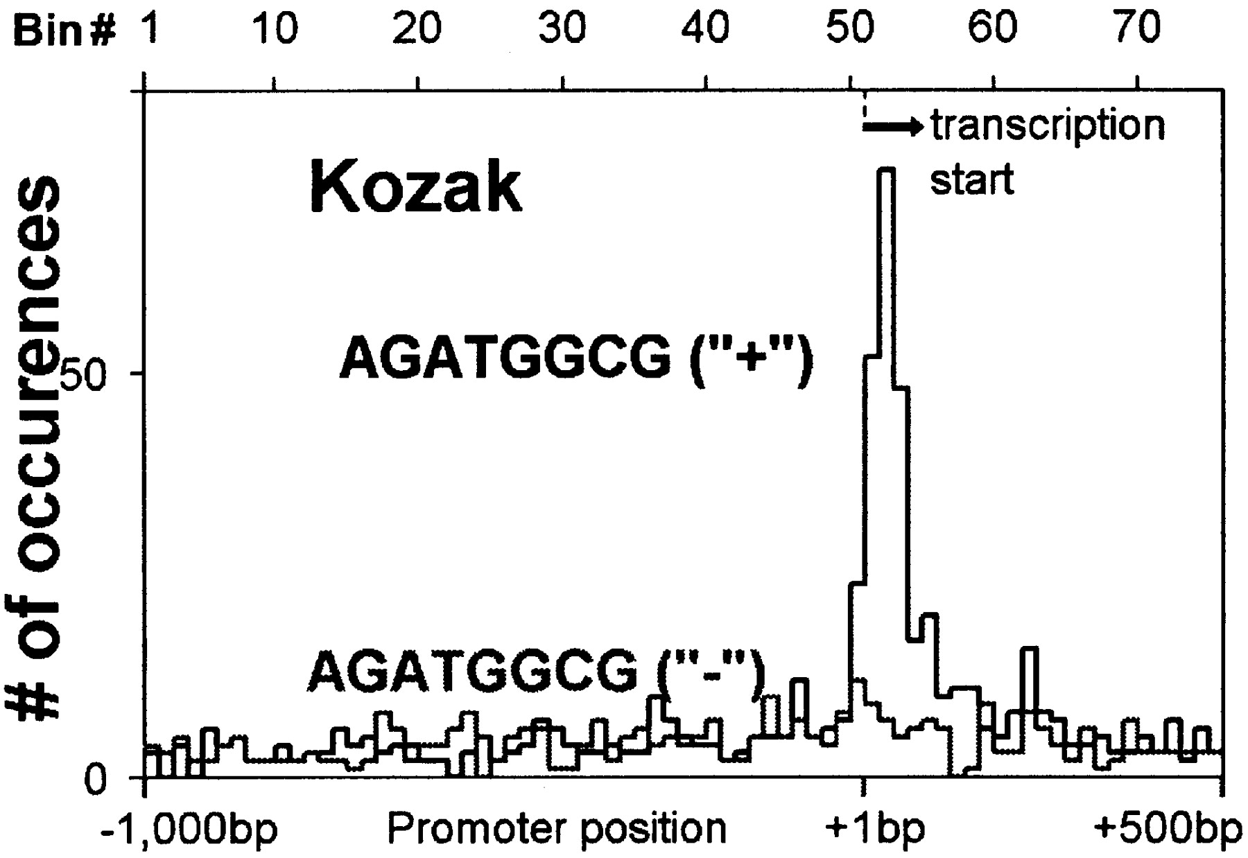 Distribution of the Kozak octamer AGATGGCG on the plus strand (+) and minus strand (–).