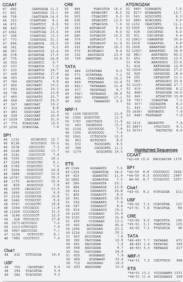 One hundred fifty-six DNA sequences are grouped into related sequences and arranged by their peak position relative to the TSS. From the left the table contains the most abundant bin, the number of times the sequence occurs in the distribution, the 8-mer sequence, and finally the P value (see text). The end of the table contains consensus sequences. Here the leftmost numbers are the bins defining the peak, followed by the clustering factor (CF), the consensus sequence, and finally the number of occurrences of the sequence in the bins that comprise the peak. Exclamation point (!) denotes sequences that are at least threefold more abundant in the maximum bin on the DNA strand presented in the table than on the opposite strand. The asterisk (*) denotes sequences used in Tables 2 and 3. IUPAC letters used to represent degenerate bases are R (G,A), W (A,T), Y (T,C), K (G,T), V (G, C, A), D (G,A,T), and N (A,T,G,C).