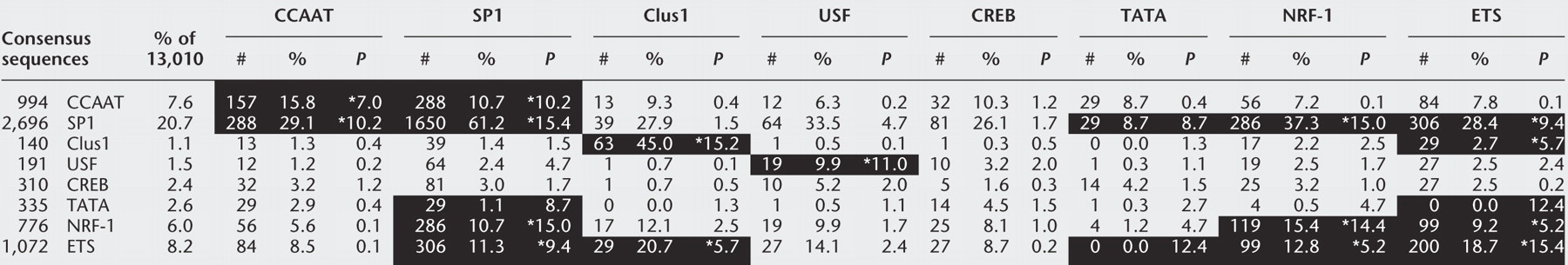 To the left are the eight consensus sequences followed by the number of their occurrences in the peak, and the percentage of promoters containing this sequence. Across the top is the same set of consensus sequences. The intersection is the number of promoters containing both sequences in the peak, followed by the percentage of the promoters containing the top sequence that also contain the sequence from the side, and the probability of having the number of elements in the intersection more dramatic than given. For example, 20.7% of the 13,010 promoters contain the SP1 sequence in the peak (2696), but 33.5% of promoters that contain a USF sequence (191) in the peak also contain the SP1 sequence in the peak. The probability of this positive correlation between these two DNA sequences is P = 4.7. Those correlations that are greater than P = 5 are shown in black, a positive correlation has an asterisk in the probability column.
