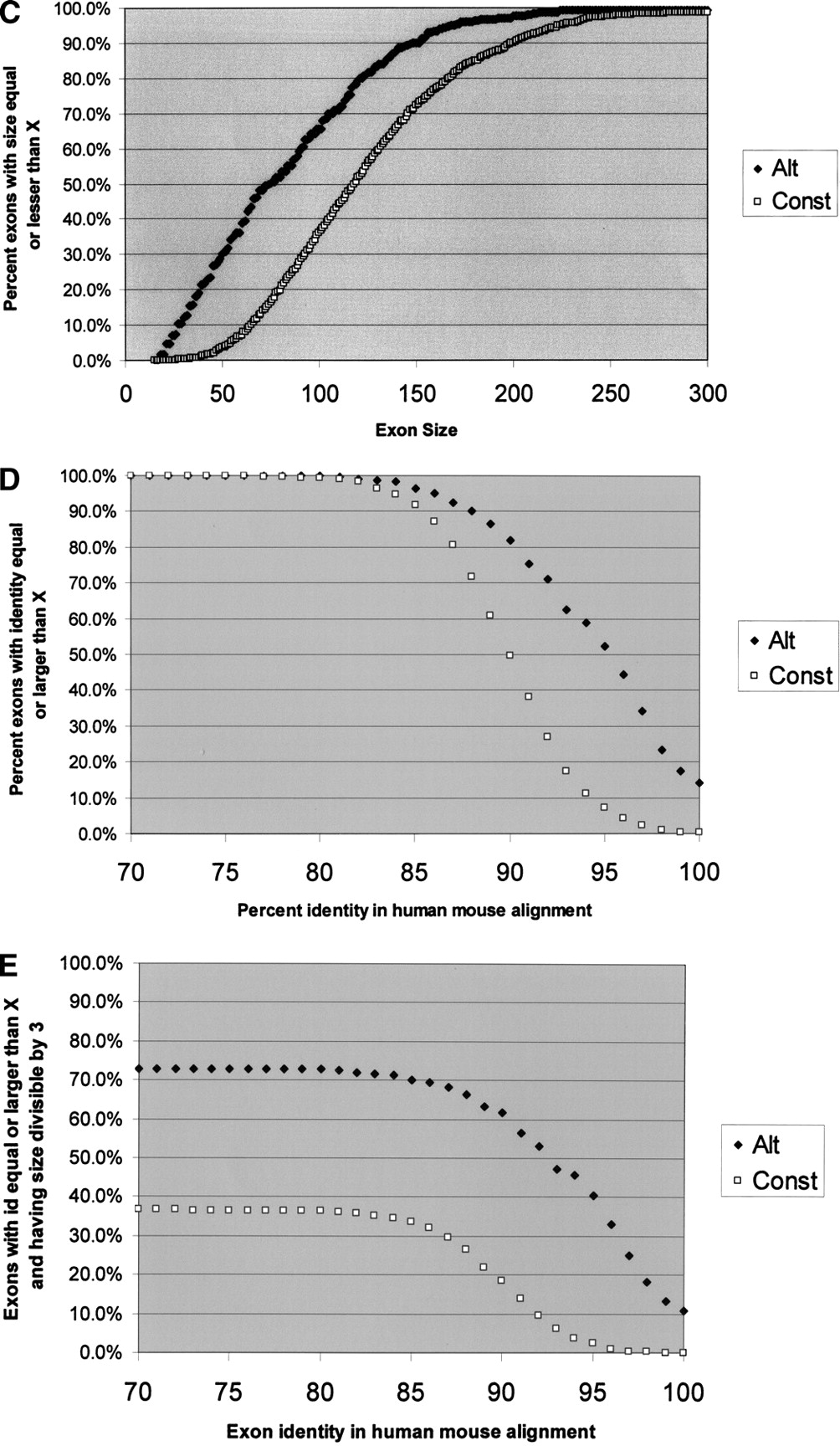 Graphic representation of the differences between alternative and constitutive exons. For each of the following curves, constitutive exons are in squares, and alternatives are in diamond shapes. (A) Length of conserved region in the nearest 100 nt of the flanking upstream intron. x-axis, length of conserved region (best Sim4 local alignment); y-axis, percent exons with upstream conserved region greater than or equal to the value in x. Conservation was detected using local alignment with the mouse 100 counterpart intronic nt. A minimum hit was 12 consecutive perfectly matching nt. (B) Length of conserved region in the nearest 100 nt of the flanking downstream intron. Axes as in A.(C) Exon size distribution. x-axis, exon size; y-axis, percent exons having size lesser or equal to the size in x. (D) Human–mouse exon identity. x-axis, percent identity in the global alignment of the human and the mouse exons; y-axis, percent exons with identity greater or equal to the value in x. (E) Human–mouse exon identity, for exons whose size is a multiple of 3. Axes as in D. Note that by combining two features we get better separation of the two exon-types.