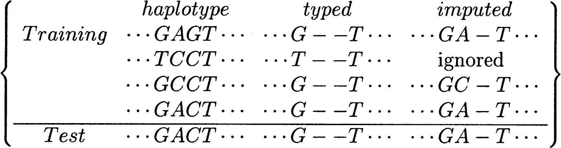 Method of imputing the second SNP present in the test haplotype from the four training haplotypes. The “haplotype” column shows the original haplotypes. The “typed” column shows only the SNPs that are typed, the first and the fourth SNP. The “imputed” column shows the haplotypes used in the imputation of the second SNP; only those haplotypes that are identical to the test haplotype on the first and fourth SNP are used in the imputation. A is imputed as of those haplotypes that agreed with the test haplotype on the first and fourth SNP, two haplotypes have an A, and one has a C.