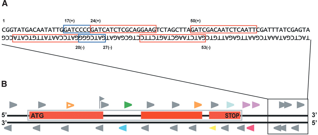 Extraction and classification of signatures from genomic sequence. (A) Example of signatures extracted from genomic DNA sequence. Red and blue boxes indicate signatures identified in the genomic sequence; a noncomplementary signature on each strand is identified from each DpnII site because of the palindromic nature of the site. Numbers above and below the sequence indicate the nucleotide position and strand information stored for each signature. Blue boxes indicate overlapping genomic signatures; the more 5′ signature can either be grouped with the 3′ signature and contain a second occurrence of GATC or be separated and consist of a signature of <17 bases or 20 bases. (B) Horizontal black lines indicate the two strands of DNA. Red boxes indicate exons of a gene on the top strand; the blue box enclosing the exons denotes the extent of the entire gene. Arrowheads indicate the positions of signatures found in the sequence. Signatures duplicated in the genome are indicated using hollow arrowheads; filled arrowheads indicate signatures unique in the genome. The format of the diagram is the same as used in the viewer on our Web page (http://mpss.udel.edu/at). Expressed signatures are indicated in color, whereas nonexpressed genomic signatures are shown in gray. The color of the triangle indicates the signature “class,” and the colors are used as follows: (orange) Class 1—in an exon, same strand as ORF; (purple) Class 2—within 500 bp after stop codon, same strand as ORF; (yellow) Class 3—antisense of ORF; (red) Class 4—in genome but not Class 1, 2, 3, 5, or 6; (green) Class 5—entirely within intron, same strand; (blue) Class 6—entirely within intron, antisense; (light green flag) Class 7—signature includes an exon/intron boundary and is spliced. Not shown are Class 0 signatures that are identified by MPSS but do not match to the genome.