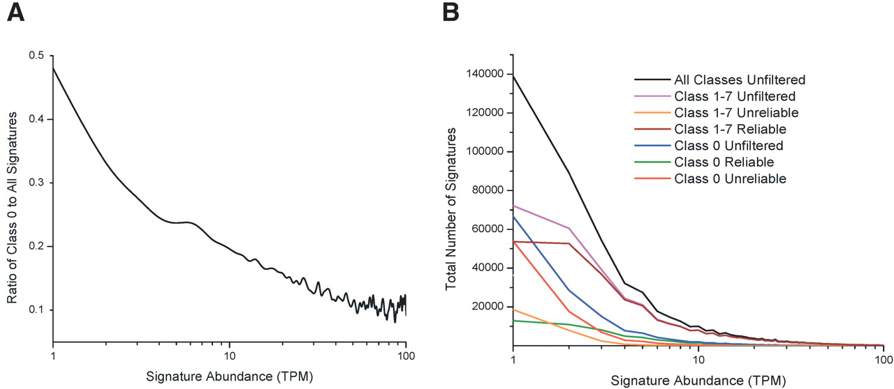 MPSS expression levels and reliability of signatures not matched to the genome. (A) The ratio was calculated as the number of distinct Class 0 signatures to the number of all expressed signatures, with no filters applied. The number of signatures in each group was calculated by joining data across all 14 libraries. The x-axis indicates each level of abundance, in TPM, for the signatures that were compared. The y-axis indicates the ratio of the two frequency counts. The x-axis is shown in logarithmic scale because the majority of the signatures are found at low abundance levels; likewise, this axis ends at 100 TPM because only a small percentage of the signatures are found above this level. (B) For each abundance level indicated on the x-axis, the number of distinct signatures is indicated on the y-axis. The data from all 14 libraries were considered together. The black line indicates the abundance levels for all 268,132 distinct signatures (no filters applied). The following colored lines correspond to each group of Class 1 to 7 signatures: (cyan line) unfiltered; (orange line) “unreliable” signatures; (brown line) “reliable” signatures. The following colored lines correspond to each group of Class 0 signatures: (blue line) unfiltered; (red line) “unreliable” signatures; (green line) “reliable” signatures.