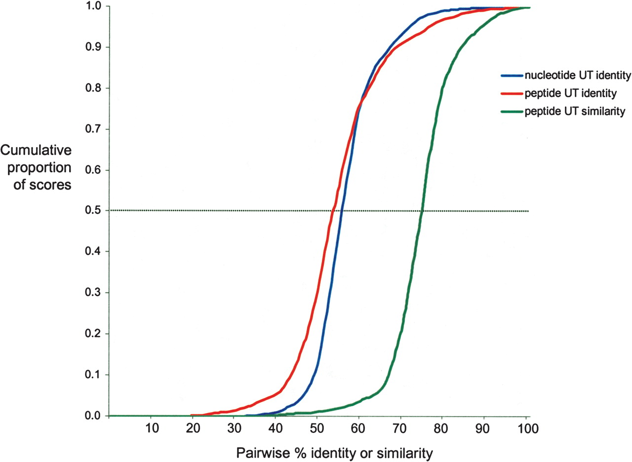 Cumulative frequency distribution plot of pairwise UT nucleotide sequence identity and pairwise UT peptide sequence identity and similarity for representatives of each of 247 bacterial and eukaryotic genera.