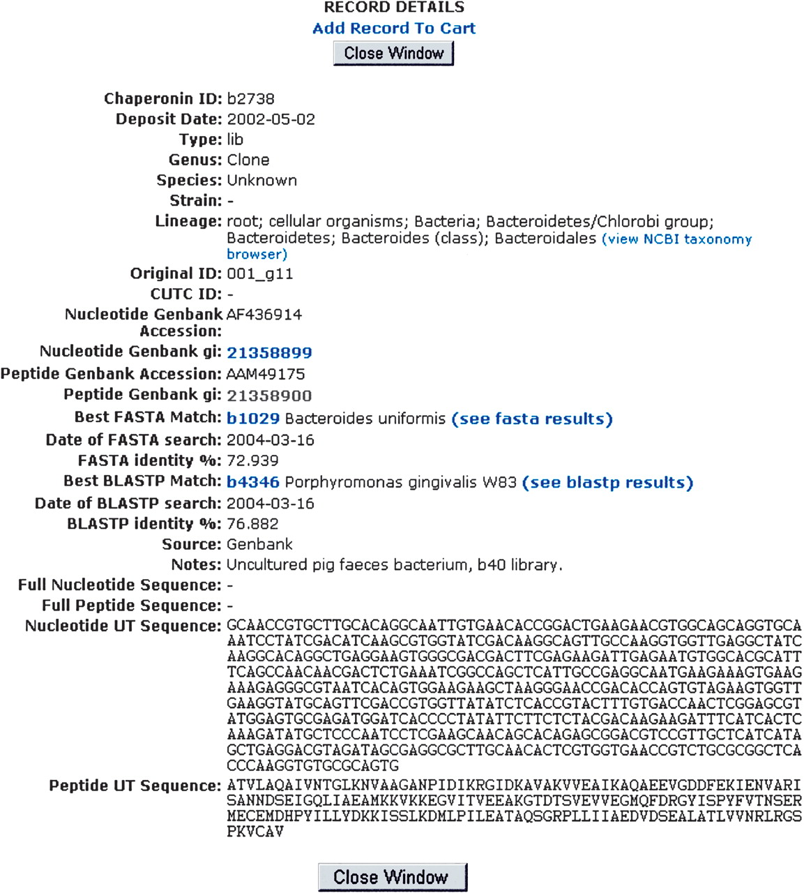 cpnDB record details. Full records include the type of record (e.g., reference, clinical isolate, field isolate, microbial population study clone), name of the organism, taxonomic lineage, links to full GenBank records, source information, and for nonreference sequences, a description of the most similar reference sequence along with links to the most recent search results.