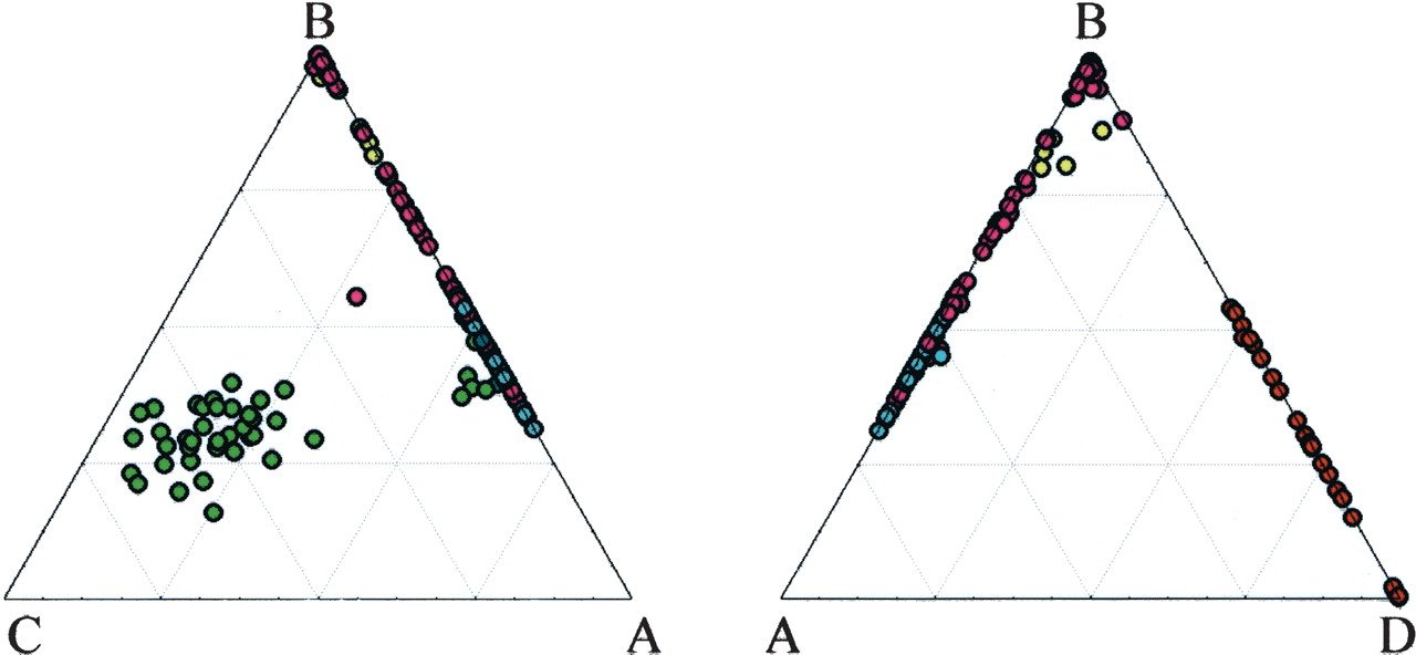 Assignment of 261 individuals from the CEPH diversity panel (Cann et al. 2002) according to their coefficients of ancestry of four inferred populations (A, B, C, and D). Green circles represent African individuals, blue circles European individuals, pink circles Asians individuals, yellow circles Oceanian individuals, and red circles Native American individuals. The appropriate representation would be a pyramid. The two faces of the pyramid represented here included all individuals at least once.