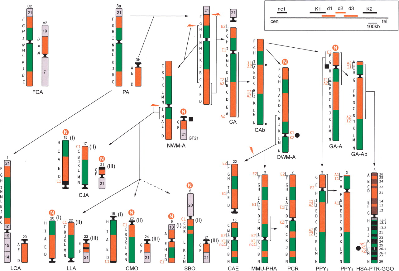 Reconstruction of the chromosome 3 phylogeny in primates. Some chromosomes are upside down to facilitate comparison. (PA) Primate Ancestor; (CA) Catarrhini Ancestor. N in a red circle stands for new centromere. The number that identifies the chromosome in each species is reported on top of the chromosome. The black letters on the left of each primate chromosome refer to the panel of BAC probes reported in Table 1 (human BACs); letters on cat chromosomes refer to the corresponding probes reported in Table 2. Letters in red are the additional probes used to delimit breakpoints, centromeres, and telomeres, reported in italics in Table I. Arrows with hatched lines point to species for which an intermediate ancestor has not been drawn. A white N in a red circle indicates the sites where new centromeres appeared during evolution. Probes used on the cat (in italics) are cat BACs identified using Overgo probes. For details see text. The black circles and the black squares are positioned at the loci where an evolutionary new centromere or a neocentromere appeared. In the rectangle on the top, right corner is reported the map of the region 3q26, in which the nc1, K1, K2, and the deleted marker d1, d2, and d3 markers are located. For more details see text.