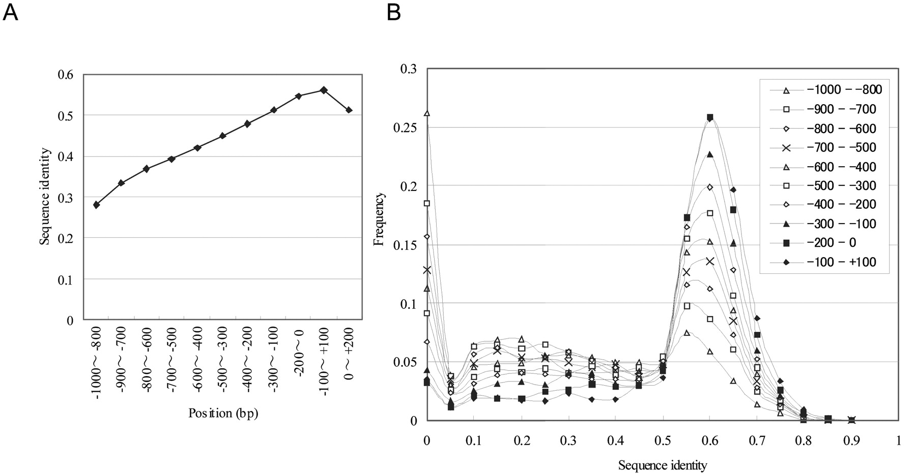 Sequence identity between human and mouse PPRs. Sequence alignments were calculated using LALIGN with the default parameters. The sequence identity was evaluated as the number of aligned nucleotides in the regions of -1000 to +200 (TSS: 0). The average sequence identities were calculated for each region (A). (B) The PPRs were separated into the 200-bp windows at the positions indicated in the inset. Sequence identity was calculated for each of the windows. Frequency as to which of the windows belong to which of the sequence identity groups represented on the horizontal axis is plotted.