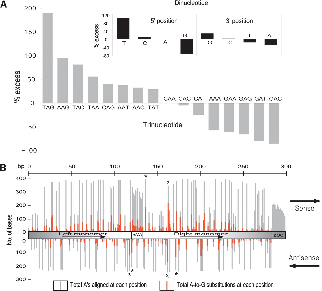 Analysis of preferred editing patterns within Alu sequences. (A) Nearest-neighbor preferences derived from 2868 Alu sequences with at least five A-to-G substitutions (n = 25,493 total edited bases) in either orientation. We determined the observed and expected frequencies of di- and tri-nucleotide patterns using the edited version of Alu sequences and their corresponding genomic sequences, respectively. We calculated percentage excess using the formula, [(observed frequency) - (expected frequency)]/(expected frequency) × 100. Previous studies (Polson and Bass 1994; Lehmann and Bass 2000) showed 5′ preferences of T ≈ A > C > G and T = A > C = G for ADAR1 and ADAR2, respectively; and 3′ preferences of nothing apparent and T = G > C = A for ADAR1 and ADAR2, respectively. (B) Identification of potential hotspots for editing within the Alus family consensus sequence, generated by separate alignments of 412 sense and 260 antisense sequences with at least 10 A-to-G substitutions using CLUSTALW (http://www.ebi.ac.uk/clustalw). We used Alus with 10 or more A-to-G substitutions to get a reasonable input size for alignment and thus minimize the effects of alignment artifacts. The number of As aligned at each position is not uniform because of sequence divergence in individual Alus. The upper panel represents the sense strand and the bottom panel the antisense strand. The basic Alu structure, as shown in the middle, consists of two nonidentical direct repeats (left and right monomer), linked by a central A-rich region. The right monomer is followed by a 3′-poly(A) that is required for Alu replication. The most frequently edited trinucleotide motif, TAG, is labeled with an *. The right monomer hotspot, present on both strands (containing a palindromic TA), is labeled with ×. Sense strands are in general more prone to editing than antisense strands, probably because of differences in availability of As (80 As and 44 As on sense and antisense Alus consensus sequence, respectively).