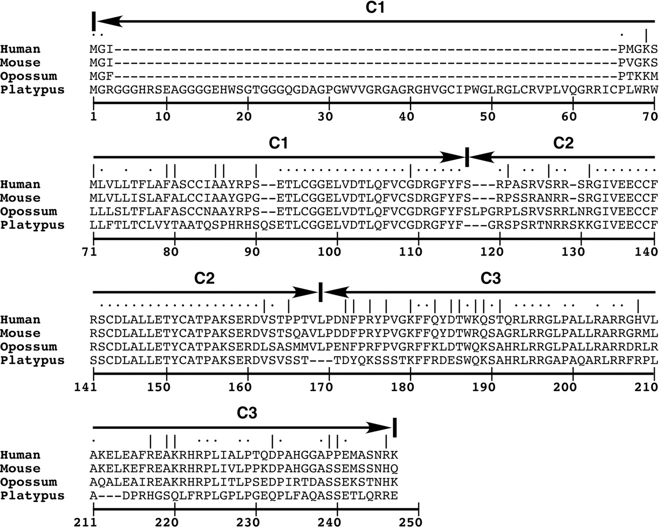 Amino acid alignment of human, mouse, opossum, and platypus IGF2. (Solid arrows) Coding exons, C1, C2, and C3; (dots above sequence) perfect amino acid agreement; (vertical slash) conservative amino acid change. Mature IGF2 peptide, amino acids 87 to 160.