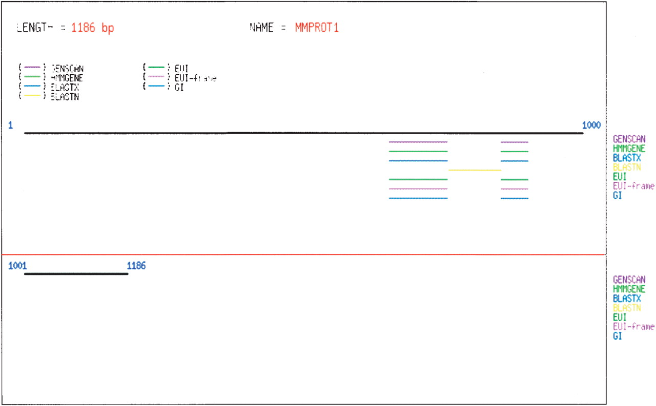 Graphical output from the EGPred server for a mouse gene (GenBank accession no. X07625, Locus ID MMPROT1) on default parameters. The solid black line indicates the query sequence. The predictions are represented as colored lines. The color code for each program is indicated at the top of the image. Longer sequences are broken into segments of 1000 bp and separated by a long red line. The length of query sequence is indicated at the top of the output image.