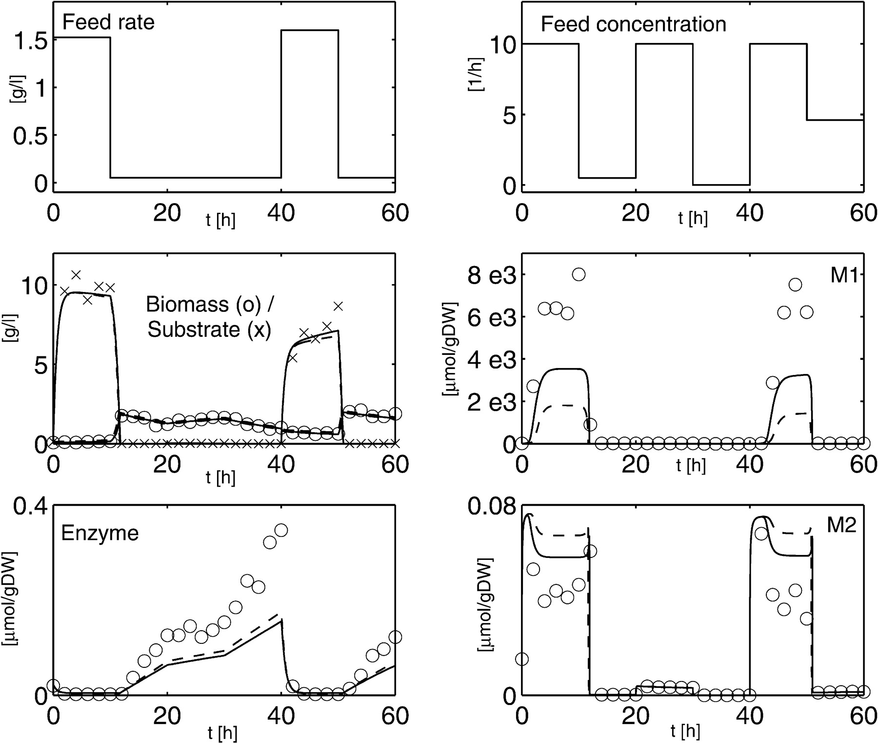 Optimal experiment, designed with W as in equation 29 (case 23). Optimal input profiles, in silico measurement results (circles), and results obtained with Model A (solid line) and Model B (dashed line) with the initial sets of parameters. Differences between the results of the two models are most notable in M1.