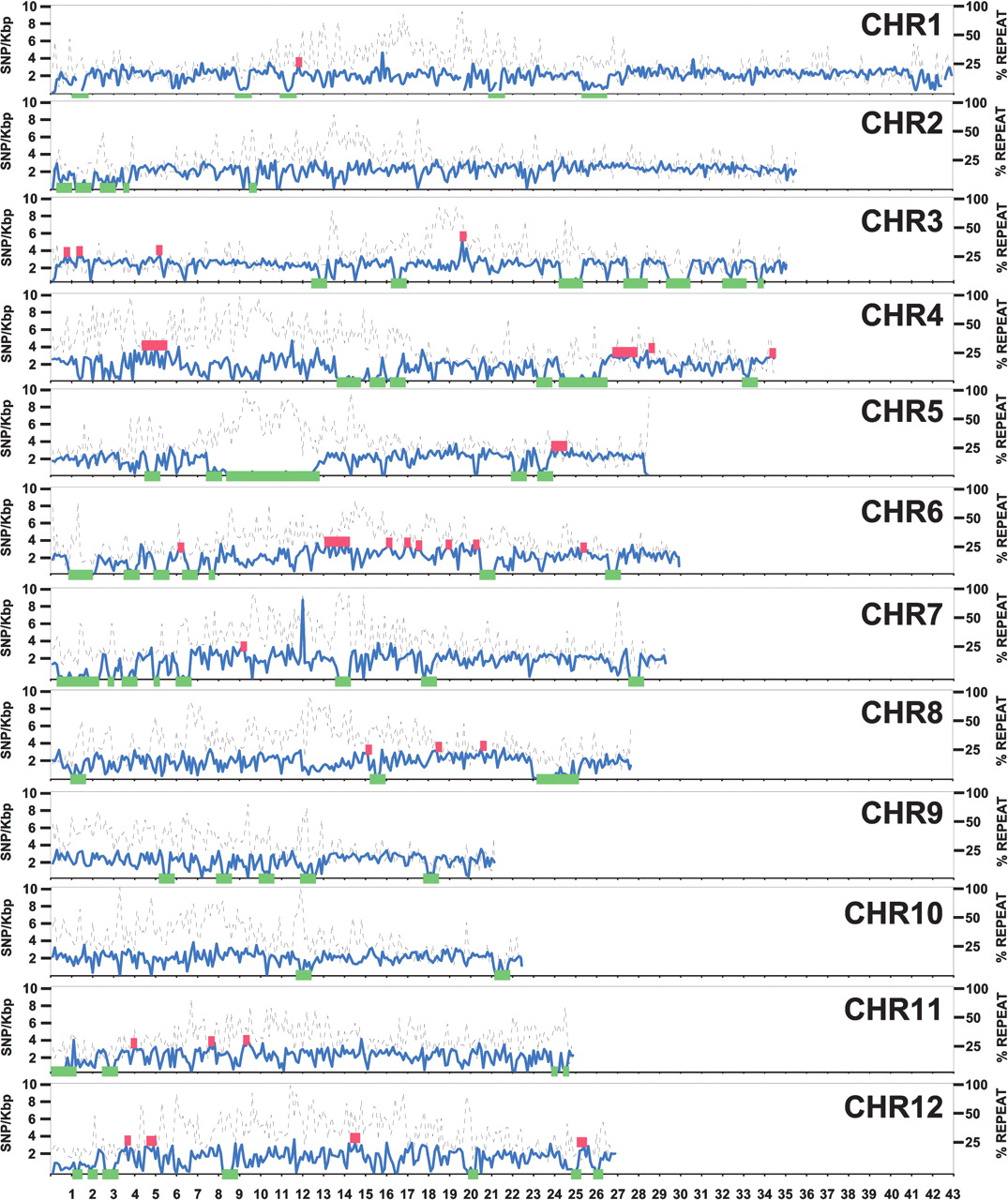 SNP variation across the rice genome. The x-axis shows the pseudomolecule position in which each tick-mark is a megabase. The y-axis shows the number of SNPs (solid blue line) per 100 kb of total DNA after subtraction of repetitive DNA. The right y-axis shows the percent of a 100-kb DNA stretch that is masked for repetitive DNA (dotted black line). Regions >300 kb that showed lower than expected SNP frequencies are noted with green blocks, and regions of higher than expected SNP frequencies are noted with red blocks.