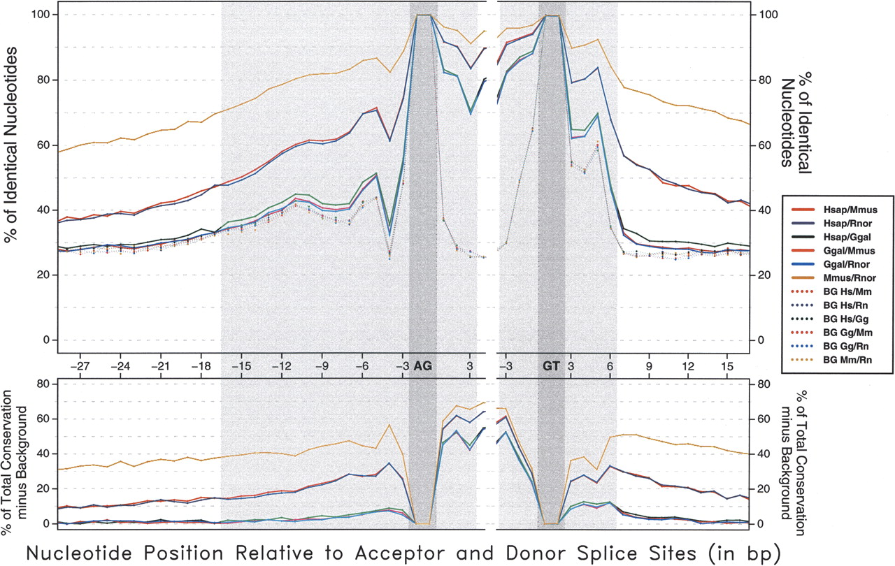 Sequence conservation level of orthologous GT-AG splice sites. Shaded gray areas correspond to the typical sequence span of splice-site signals. The average identity between the orthologous sequences is plotted across the splice signals (see Discussion). Background identity has been estimated from pairs of nonorthologous sites. (Bottom) The result of subtracting background conservation from total conservation.