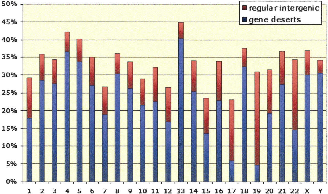 Chromosome coverage by gene deserts (in blue) and regular intergenic regions (in red).