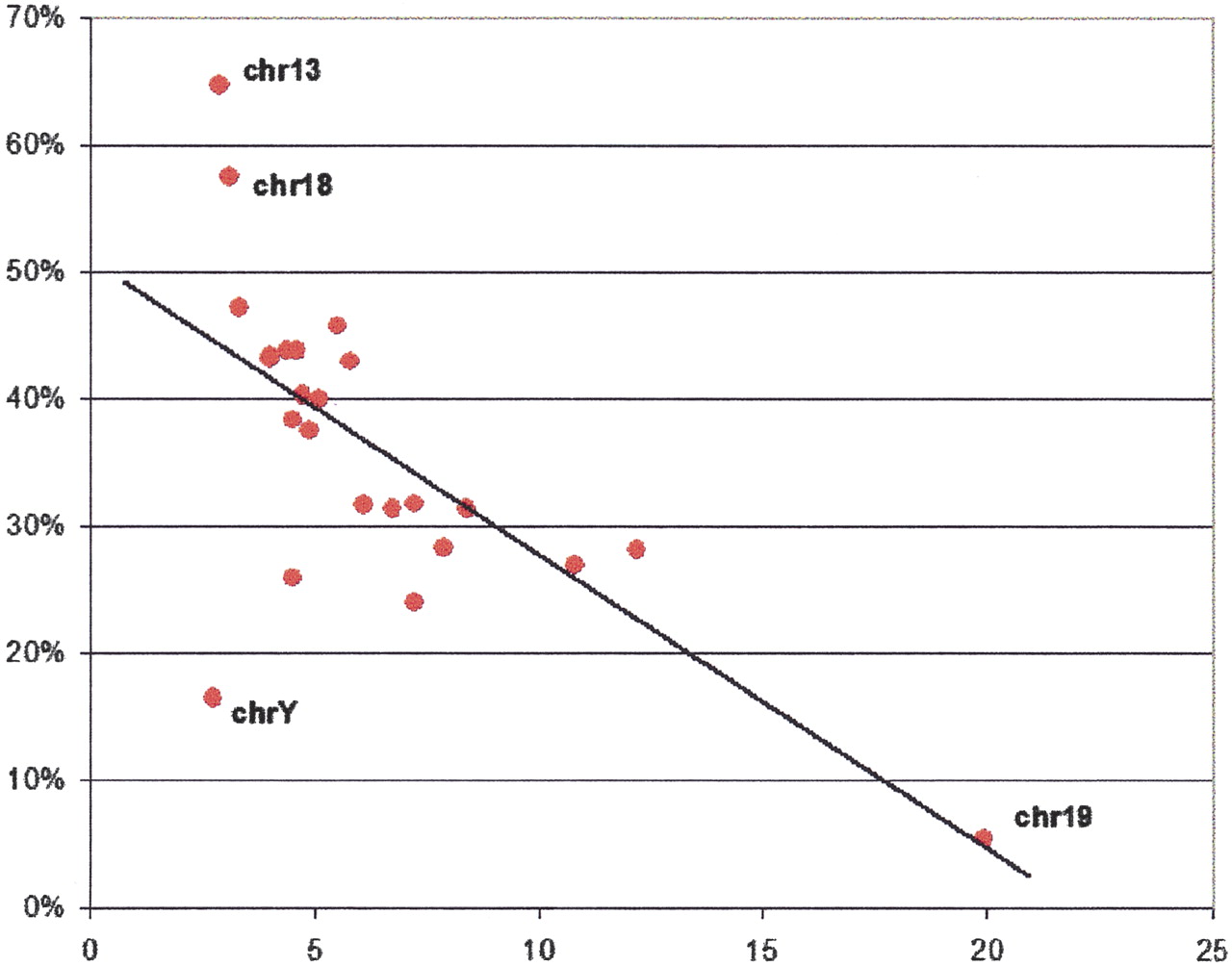 Percentage of genes with UTRs conserved in chicken (vertical axis) versus the gene density (based on RefSeq annotation; in genes per 1 Mb of sequence as plotted at the horizontal axis). Red dots describe different human chromosomes.