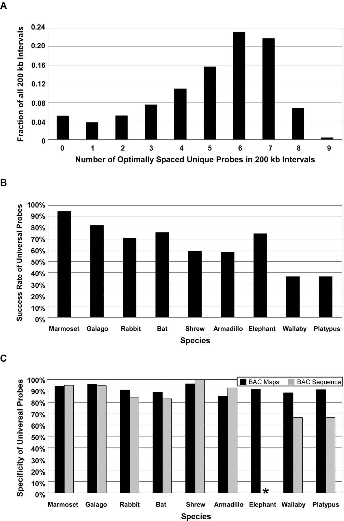 Characterization of the mammalian whole-genome universal hybridization probe set. (A) To estimate the fraction of the human genome associated with one or more mammalian universal probes, the number of unique probes selected using an optimal spacing parameter of 30 kb in all 200-kb windows (50-kb slide) across the genome, excluding intervals that contained a sequence gap in the human assembly, was determined. The result of that analysis was plotted as the fraction of all 200-kb intervals that included N number of optimally spaced unique probes. (B) To estimate the ability of universal probes to identify a BAC clone from mammalian libraries, a sample of n = 96 universal probes were hybridized to a panel of nine representative mammalian BAC libraries. The success rate, as defined by the percentage of universal probes that detected at least one positive BAC clone, for each of the nine species is indicated. (C) Specificity of the universal probes, as measured by physical mapping, and sequence analysis of individual isolated BAC clones is indicated. The number of BAC sequences included in the analysis for each species is as follows: marmoset, n = 21; galago, n = 20; rabbit, n = 19; bat n = 12; shrew, n = 16; armadillo n = 14; wallaby, n = 12; and platypus, n = 9. In the case of marmoset, shrew, and armadillo, probe specificity as measured by analysis of sequenced BAC clones was slightly higher than that of the probes themselves. Since multiple linked probes were included in the test set of probes, in these species many clones were positive for more than one probe and therefore facilitated a more accurate selection of orthologous versus nonorthologous clones for sequencing. *No BAC sequence is available for elephant.
